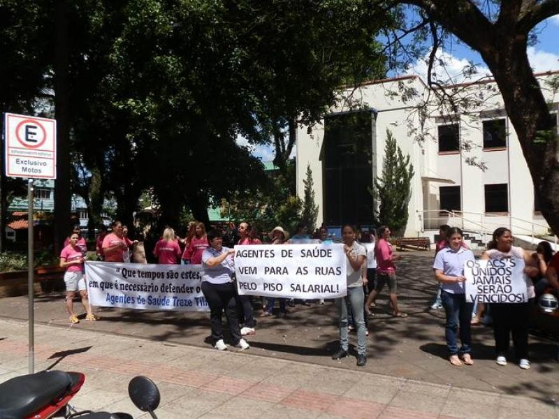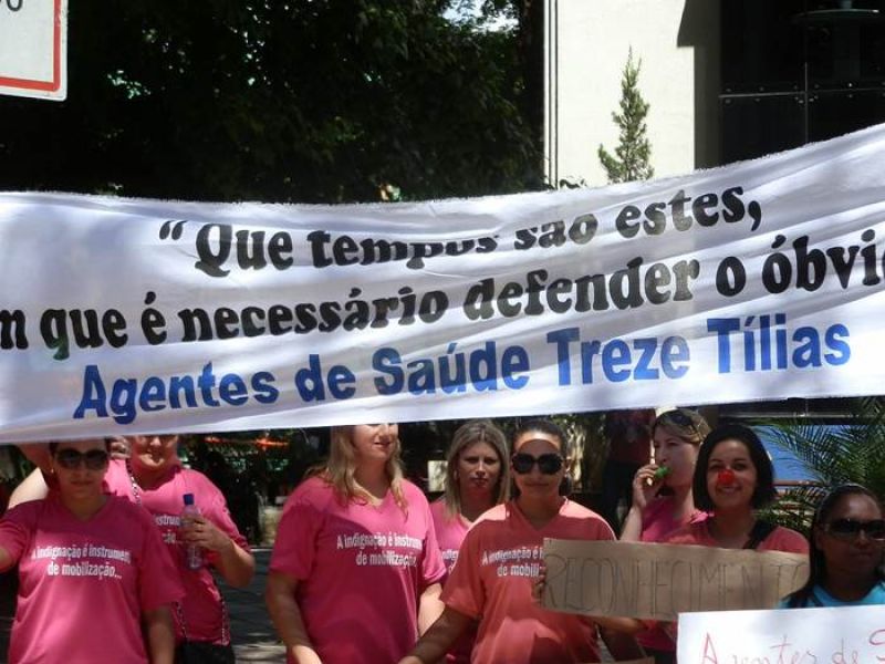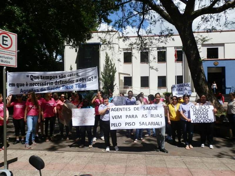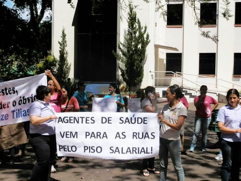 12/11/2013 Agentes Comunitários de Saúde (ACS) dos municípios de Vargem Bonita, Água Doce, Catanduvas, Treze Tílias e Joaçaba se reuniram nesta terça-feira (12) na praça Adolfo Konder, em frente à prefeitura de Joaçaba, para protestar pela valorização da categoria. A mobilização ocorreu no dia nacional da mobilização dos agentes de saúde em todo o país. Os ACS pedem o pagamento do piso salarial de R$ 950 destinados pelo Governo Federal, mas que não chegariam integralmente aos agentes nos municípios devido ao desconto dos encargos trabalhistas. Conforme a agente Simone Regina Botelha, que trabalha em Treze Tílias, além do piso é reivindicada a valorização da categoria nos municípios da região da AMMOC. Ela comenta que está em análise na Câmara dos Deputados um projeto de lei que projeto de lei que estabelece piso salarial para agentes comunitários de saúde. Porém, a matéria causa divergência, principalmente, na bancada do Partido dos Trabalhadores (PT) que liderou a oposição ao texto dizendo que a União não pode arcar com os custos trabalhistas do piso, sem dividir a responsabilidade com estados e municípios. Pela proposta, o piso salarial seria de R$ 950 em 2014, R$ 1.012 em 2014 e reajustes conforme a inflação a partir de 2015. Atualmente não há um mínimo salarial, mas o governo federal repassa por meio de portaria R$ 950 por mês aos municípios para cada agente comunitário. Como não há piso, alguns municípios transferem aos profissionais apenas o salário mínimo e utilizam o restante dos recursos para outras finalidades. O governo se opôs ao projeto que tramita em regime de urgência porque não quer arcar com os reajustes anuais do piso, tanto que o líder do governo, Arlindo Chinaglia (PT-SP), afirmou que se o texto for aprovado sem alterações, a presidente Dilma Rousseff poderá vetá-lo.