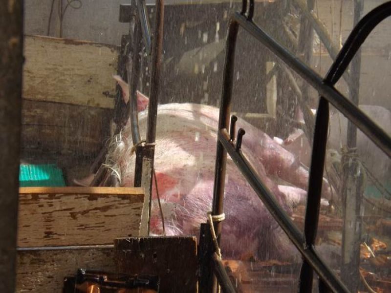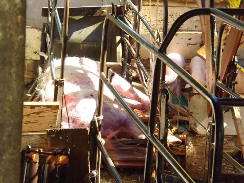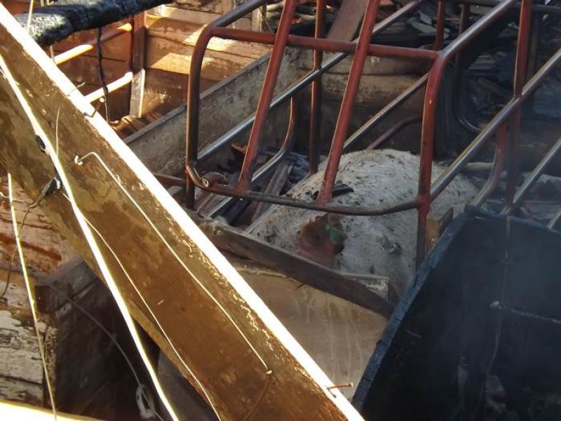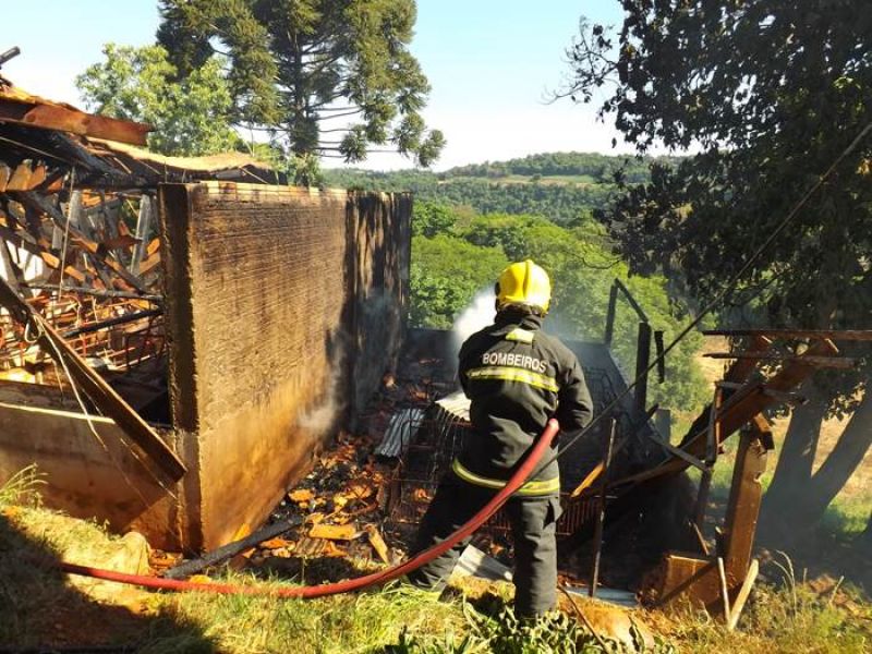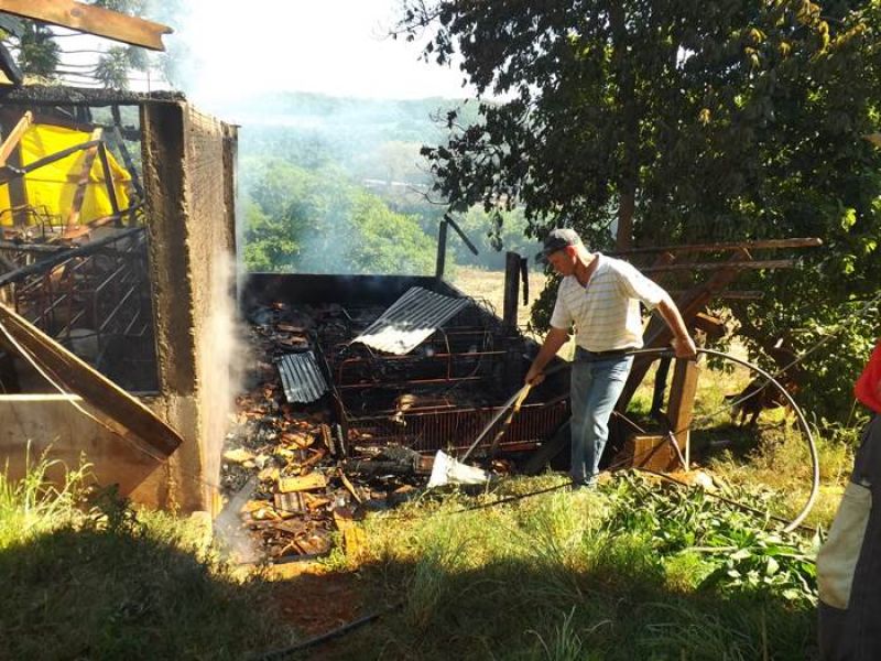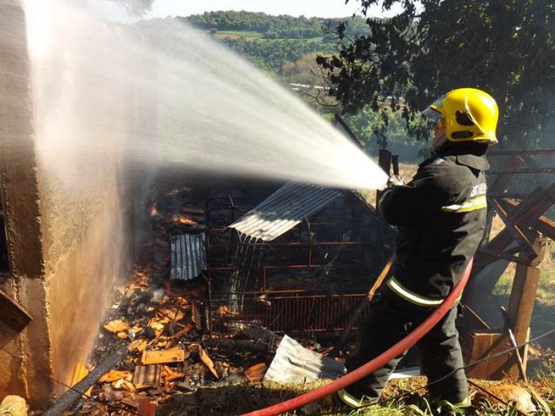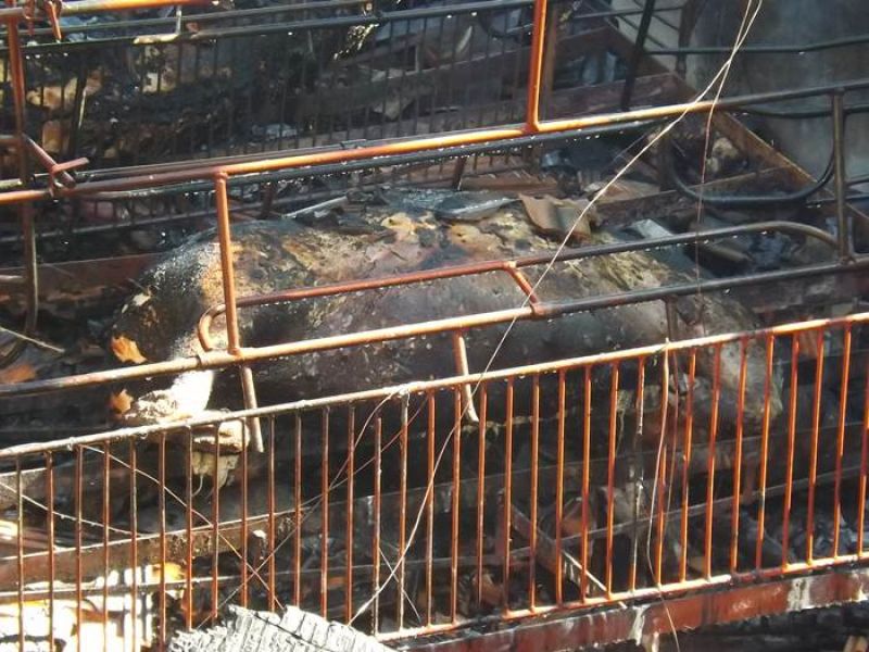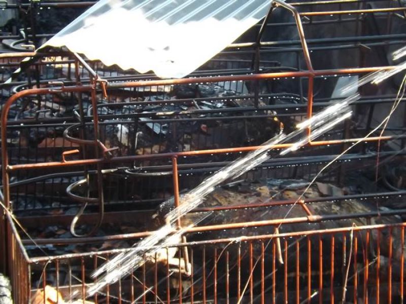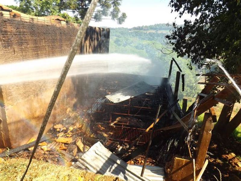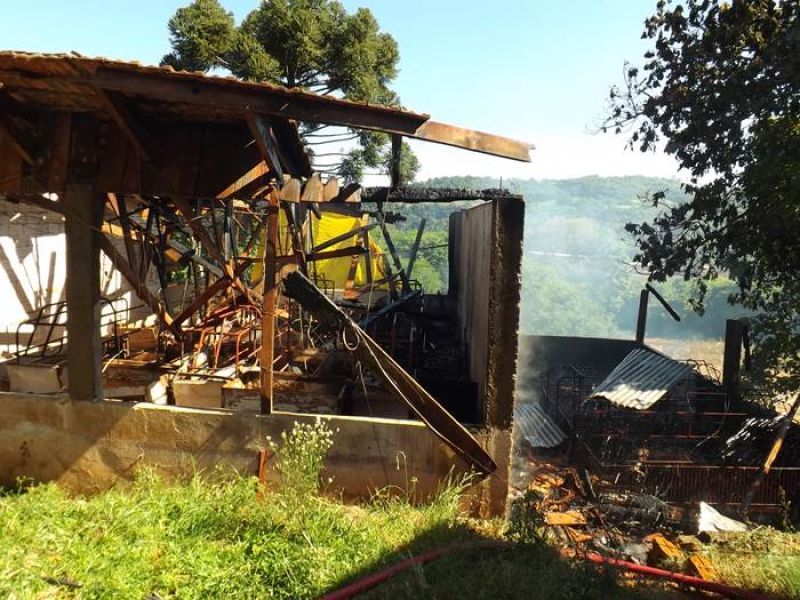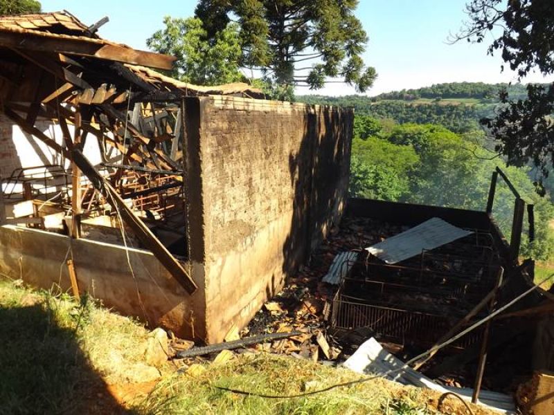 14/11/2013 Um incêndio de grandes proporções destruiu uma pocilga no interior de Joaçaba e matou mais de 60 suínos na tarde desta quinta-feira (14). O fato ocorreu por volta das 16h30 na linha Pato Roxo, próximo a Lacerdópolis, na propriedade de Carlos Chiamolera. Não havia ninguém em casa no momento do incêndio. O proprietário suspeita que o fogo tenha começado em um curto-circuito. Segundo ele, a fiação elétrica era bastante antiga. Mais de 80 leitões em fase de amamentação estavam no local. Alguns foram salvos, mas no total, oito matrizes e mais de 50 leitões morreram carbonizados. O Corpo de Bombeiros utilizou aproximadamente 4 mil litros de água para extinguir as chamas e fazer o rescaldo. Chiamolera estima um prejuízo de mais de R$ 20 mil somente com os animais. O proprietário não possuía seguro, tanto dos animais como da pocilga.