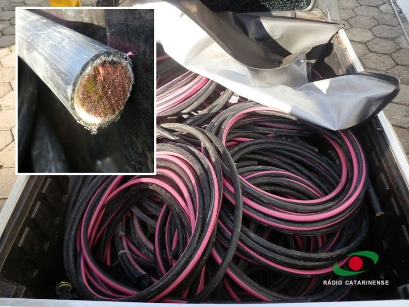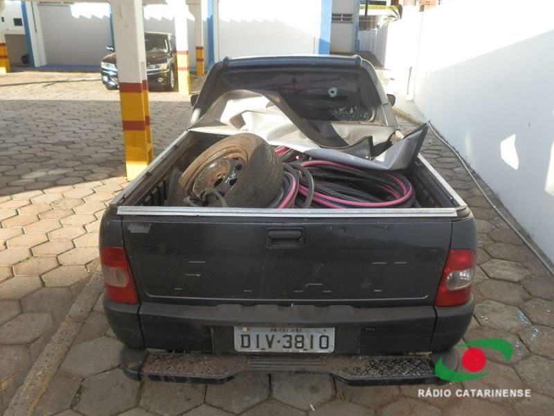 20/12/2013 A madrugada desta sexta-feira (20) foi violenta em Água Doce com perseguição, troca de tiros e prisão. O fato ocorreu por volta das 4 horas. A Polícia Militar foi informada pela segurança da usina eólica, distante cerca de 80 quilômetros do centro da cidade, de que ladrões estariam em três carros furtando cabos de cobre. A denúncia já havia sido feita outras vezes, porém, devido à distância, a polícia ia ao local, mas não conseguia localizar os criminosos. Nesta sexta-feira, assim que a PM chegou a ao parque eólico três veículos (Saveiro de cor preta, um Monza escuro e uma Strada de cor escura) fugiram em alta velocidade no sentido Palmas (PR), dando início a uma perseguição. A perseguição se deu por 10 quilômetros na BR-153. De dentro do veículo que puxava o comboio de fuga os ladrões começaram a atirar contra os policiais, que revidaram. Um tiro disparado pela polícia atingiu o vidro traseiro da Fiat Strada placas DIV-3810 de São João (PR), momento em que o condutor parou o veículo no acostamento. A Strada estava carregada com cerca de 700 kg de cabos de cobre.