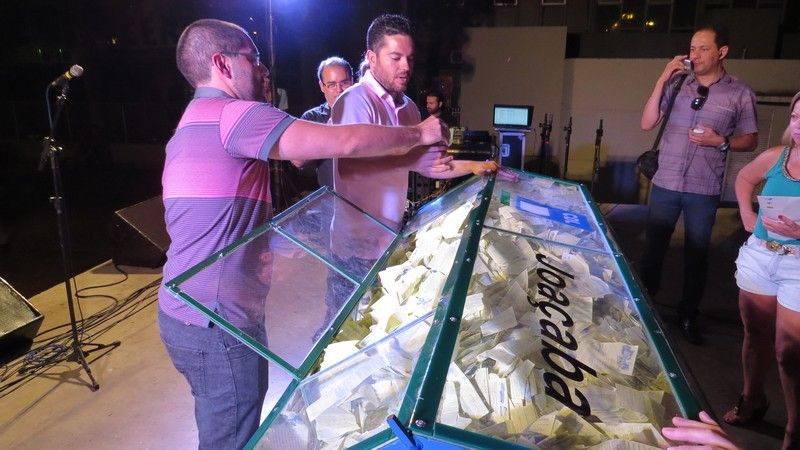 23/12/2013 O sonho de ganhar um carro zero quilômetro, uma moto ou então uma TV de 42 polegadas, habitou o imaginário de milhares de consumidores que efetuaram suas compras nas lojas que aderiram a promoção “Joaçaba Um Grande Shopping a Céu Aberto”. Um sonho que se transformou em realidade para três pessoas que depositaram seus cupons e principalmente esperança nas urnas distribuídas pelo comércio local. Como verdadeiras “agulhas em palheiros”, no meio de quase 1 milhão de cupons, os felizardos emergiram de um mar de papel e foram conhecidos na noite desta segunda-feira (23) durante sorteio realizado na Praça da Catedral. “É muita sorte ganhar um carro zero quilômetro de uma hora para outra” destacou o operário Emanuel Dias, que acompanhou atento ao sorteio ao lado de dois filhos e com esperança de que um dos seus três cupons fosse o sorteado.