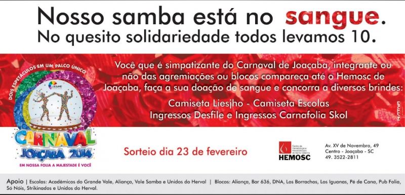 07/01/2014 A Liga Independente das Escolas de Samba de Joaçaba e Herval d´Oeste (LIESJHO) promove a campanha “Nosso samba está no sangue. No quesito solidariedade todos levamos 10”. A campanha elaborada em conjunto com o Hemosc/Joaçaba tem por objetivo auxiliar na captação de doadores para a instituição.