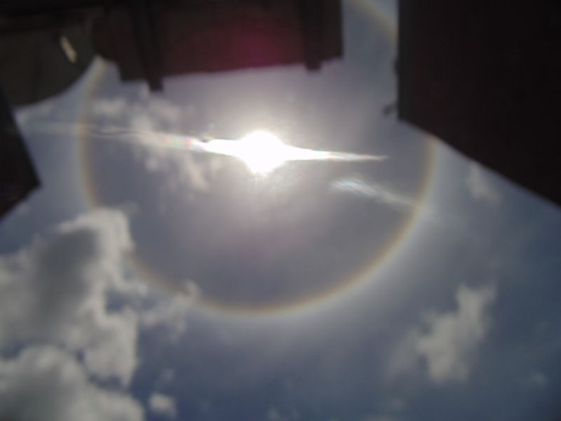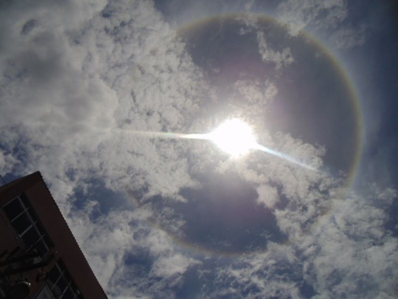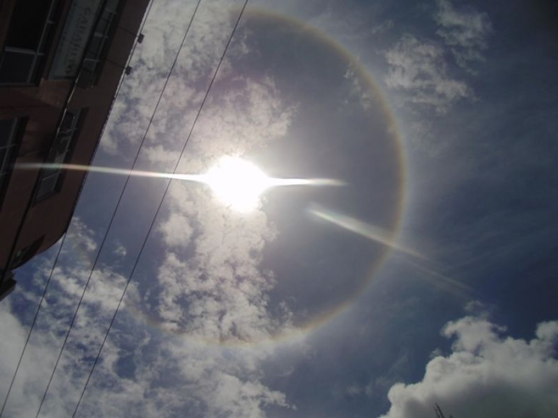 14/01/2014 Durante a apresentação do Grande Jornal a Rádio Catarinense recebeu diversas ligações de moradores de Joaçaba que observaram no céu, por volta do meio-dia, uma coroa colorida em volta do sol. O fenômeno se chama Halo, e, segundo a meteorologia acontece quando existe a presença de uma nuvem do tipo 'Cirrustratus', que é uma nuvem que cobre grandes áreas em extensão da alta atmosfera, composta apenas por finos cristais de gelo. Os raios solares ao incidirem sobre estes cristais de gelo são refratados e formam um arco-íris ao redor do sol. Como a luz branca contém, potencialmente, todas as demais cores, a sua incidência nos cristais produz um caleidoscópio cromático que brilha de 5 km a 10 km acima de nós, na troposfera superior. Em outras palavras, os cristais funcionam como espelhos e prismas, "filtrando" diferentes comprimentos de onda (cores) das ondas luminosas solares. As fotos que ilustram o texto foram feitas no prédio da emissora na avenida XV de Novembro, Centro de Joaçaba.