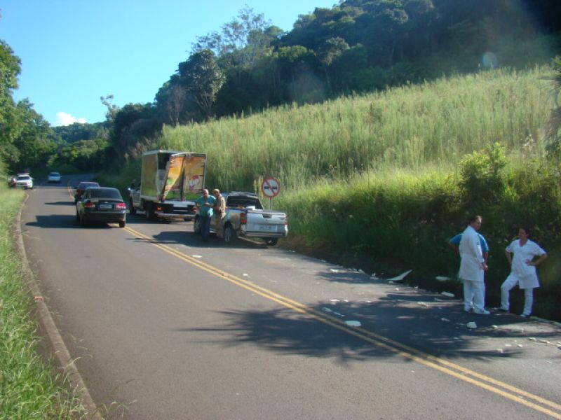 22/01/2014 A Rádio Catarinense obteve as imagens de câmera de segurança de um estabelecimento comercial às margens do acesso Egídio Pozzobom em Herval d’ Oeste que mostram os dois caminhões que supostamente teriam causado acidente com quatro veículos. Segundo os relatos dos condutores envolvidos, a imprudência dos caminhoneiros quase causou uma tragédia na tarde desta terça-feira (21). Por volta das 15h30, dois caminhões, um de cor branca e outro de cor escura, possivelmente azul, desciam carregados com retroescavadeiras o acesso Egídio Pozzobom. Na pista contrária uma fila de cinco veículos seguia em direção ao trevo da BR-282. O condutor de um caminhão puxava a fila. Assim que ele passou o motorista de uma caminhonete furgão F-350 placas de Chapecó, carregada de frango congelado, percebeu que um caminhão que transportava uma máquina fazia ultrapassagem forçada em velocidade considerável. O motorista do furgão, Leandro Dalmoro Gosh, de 36 anos, conseguiu apenas jogar para a sarjeta para evitar colisão frontal, mas teve o baú atingido, causando grande estrago. Na sequencia estavam uma Montana placas de Joaçaba, um Fox placas de Herval d’ Oeste e uma Honda Biz. A condutora da motocicleta acabou caindo e fraturando um dos pés. Ela foi levada ao Hospital Universitário Santa Terezinha (HUST) de Joaçaba para avaliação médica. Os caminhões não pararam após o acidente. Ouvintes da Rádio Catarinense que acompanharam a transmissão entraram em contato com a emissora para dar informações sobre os veículos mencionados. A Polícia Militar foi acionada, orientou o trânsito que ficou lento nos dois sentidos e fez o registro do acidente. Câmera de monitoramento da Polícia Militar localizada em frente ao cemitério Nossa Senhora da Glória também registrou o evento. Os motoristas dos veículos atingidos suspeitam que os caminhões pudessem estar disputando um possível racha.