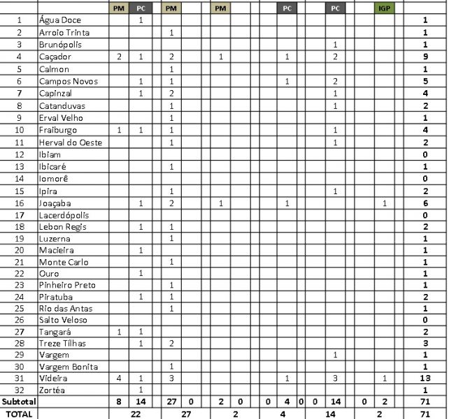 22/01/2014 A Rádio Catarinense teve acesso à lista de distribuição de 71 viaturas destinadas à 10ª Região de Polícia Militar (RPM), com sede em Joaçaba. A solenidade de entrega aconteceu na noite desta quarta-feira (22) no estacionamento do novo terminal rodoviário de Joaçaba, que foi inaugurado com a presença do governador Raimundo Colombo. Participaram também o secretário de estado da Segurança Pública, Cesar Augusto Grubba, o comandante-geral da Polícia Militar, coronel Nazareno Marcineiro, o delegado-geral da Polícia Civil, Aldo Pinheiro D'Ávila e o diretor-geral do IGP em SC, Rodrigo Tasso. Os veículos são dos modelos Fiat Palio Weekend, Renault Logan, Renault Duster (para o Pelotão de Patrulhamento Tático) e GM/S-10. As viaturas serão destinadas para a Polícia Militar (37), Polícia Civil (32) e Instituto Geral de Perícias (IGP – 2), totalizando 71 viaturas distribuídas para 32 municípios de abrangência da 10ª RPM. O investimento do governo do estado, através da Secretaria de Estado da Segurança Pública pelo programa Pacto pela Segurança foi de R$ 3.271.040,00.