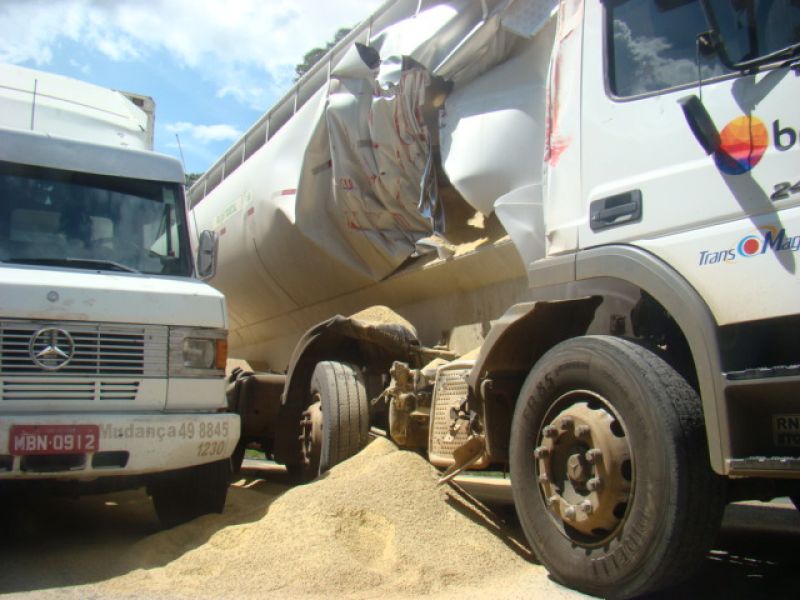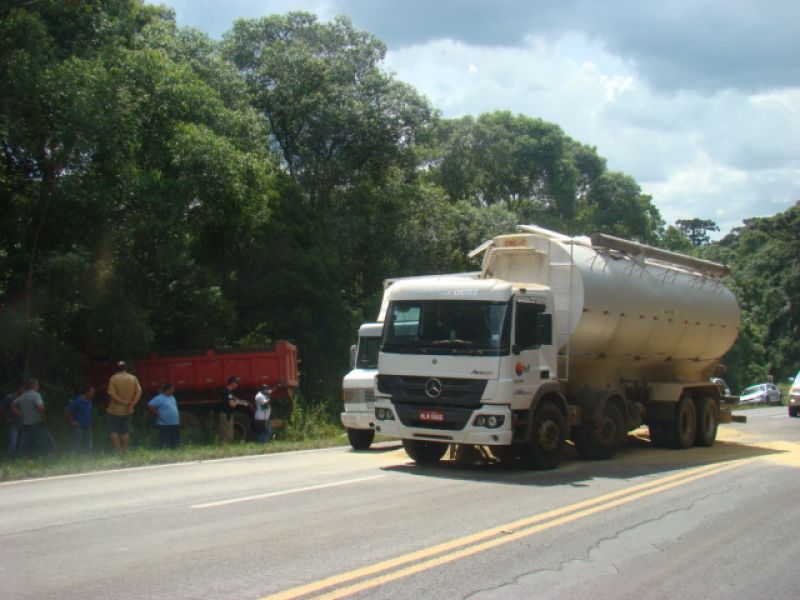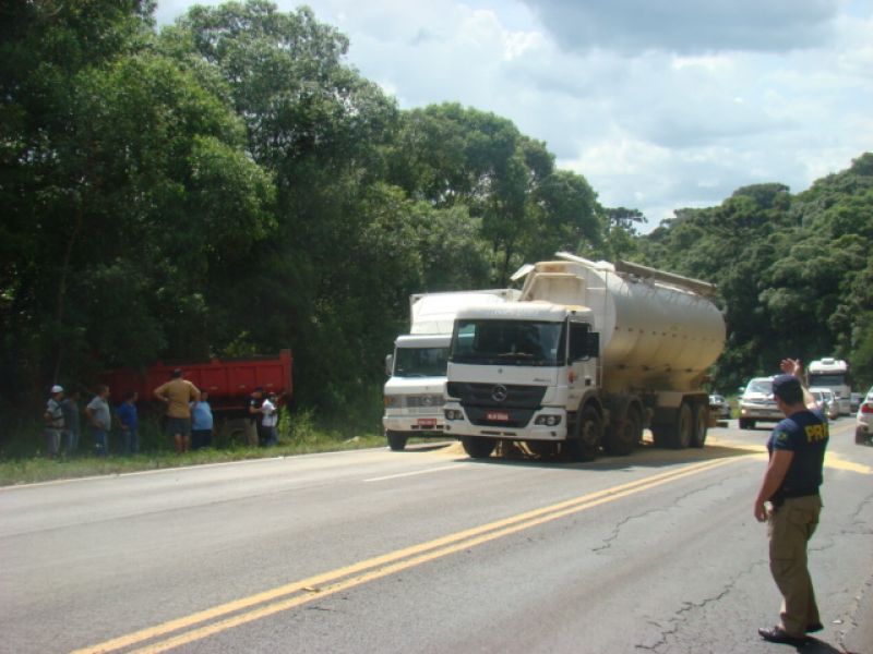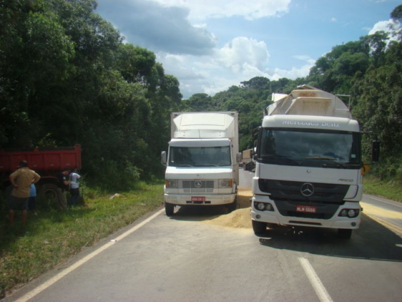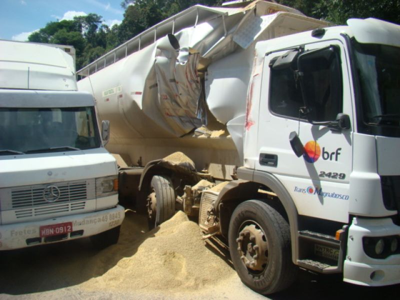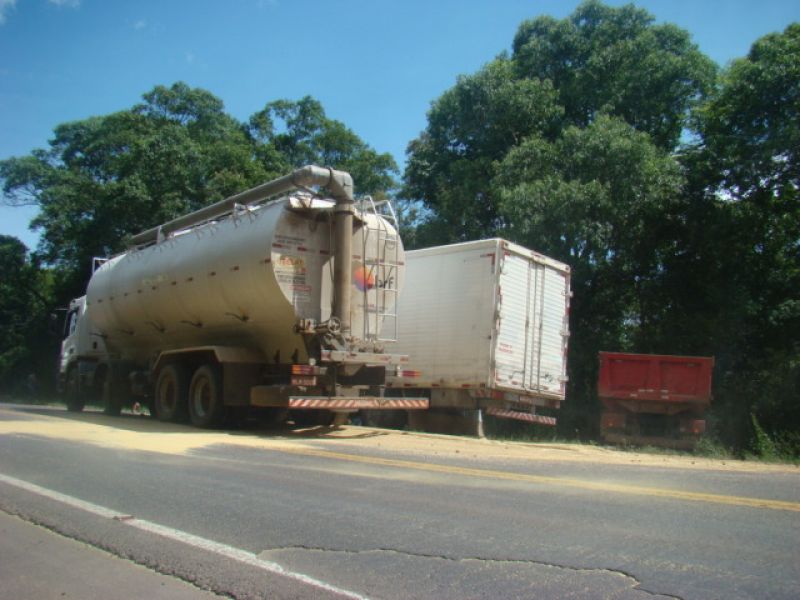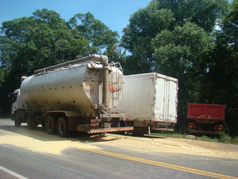 23/01/2014 Um caminhão graneleiro colidiu em outros dois caminhões na tarde desta quinta-feira (23) em Joaçaba. O acidente ocorreu por volta das 15h30 no km 390 da BR-282, nas proximidades do posto da Polícia Rodoviária Federal (PRF). Os veículos faziam sentido Catanduvas/Joaçaba, um caminhão Mercedes-Benz da BRF placas de Catanduvas carregado de ração, um Mercedes-Benz 912 baú com placas de Campos Novos e um caminhão Iveco basculante placas de Joaçaba. Segundo o condutor da caçamba, A.M.C., de 36 anos, ele subia na terceira pista quando avistou o baú parado no asfalto devido a problemas mecânicos. Ele disse que reduziu a velocidade e ligou o alerta, quando em seguida o graneleiro bateu na traseira da caçamba jogando o veículo para fora da pista, e ainda atingiu o baú. Uma pedra segurou a caçamba para não descer um barranco acentuado. Com o choque o graneleiro rompeu espalhando ração no asfalto. O trânsito ficou lento. Ninguém se feriu. Com pás os envolvidos ajudaram a retirar o material da pista. A PRF orientou o tráfego e fez o boletim de acidente de trânsito.
