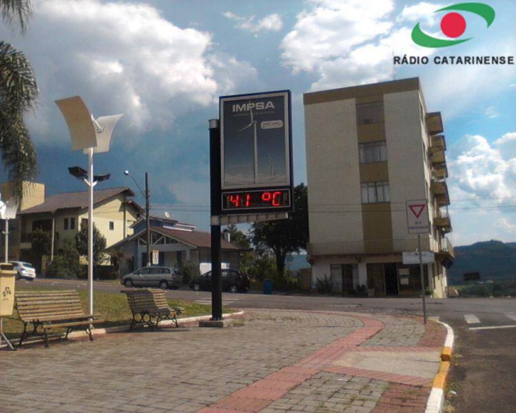 30/01/2014 A onda de calor que predomina sobre Santa Catarina deve durar pelo menos mais duas semanas, segundo previsão da Climatempo, um dos institutos meteorológicos mais importantes do país. A região Meio Oeste é uma das que mais vem sentido o efeito das altas temperaturas. Nesta quanta-feira (29) leitor do portal de notícias da Rádio Catarinense encaminhou uma foto que mostra que o sol escaldante vem castigando fortemente. Para se ter uma ideia, às 16h, na praça João Macagnan, no Centro de Água Doce, o termômetro marcava 41ºC. Conforme o Climatempo, os dias de sol entre algumas nuvens com chance de chuva rápida de verão entre a tarde e noite será comum, por vezes acompanhadas de temporais localizados e a sensação de calor pode alcançar 50ºC. Neste período o índice ultravioleta segue máximo, sendo de fundamental importância os cuidados com a pele. Há cerca de seis meses, a cidade de Água Doce, uma das mais frias no estado, registrava neve demonstrando os contrastes do clima tropical.
