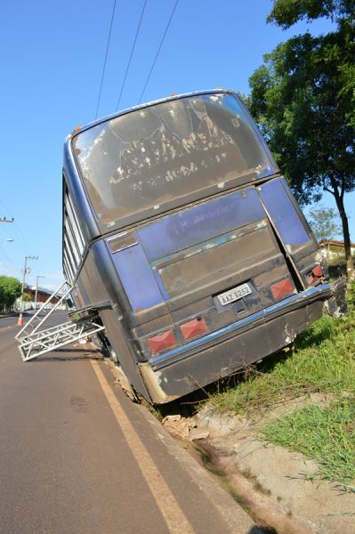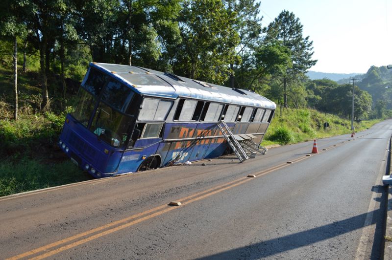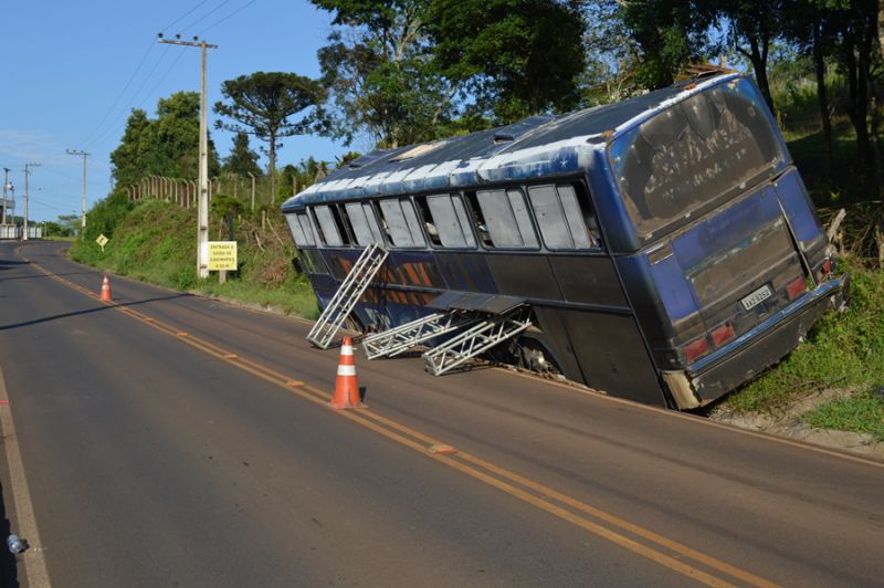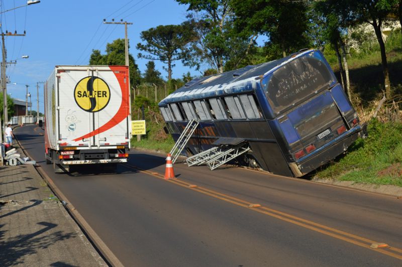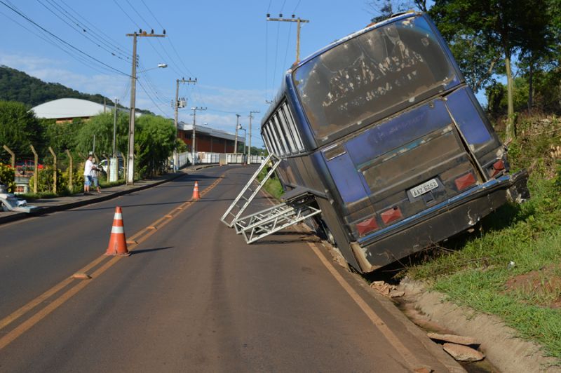 Estruturas metálicas para montagem do palco foram usadas para evitar o tombamento do ônibus que ainda estava no acesso Egídio Pozobom até por volta das 10h da manhã desta segunda-feira (03). O motorista aguardava a chegada de um guincho para fazer a remoção. O ômibus tem placas de Içara (SC) e estava se deslocando que Curitiba para Herval.