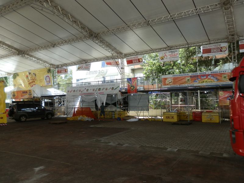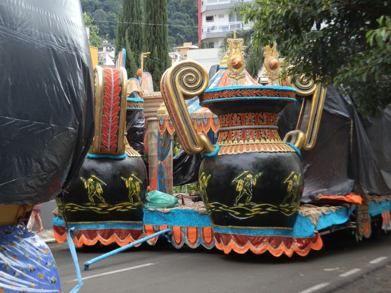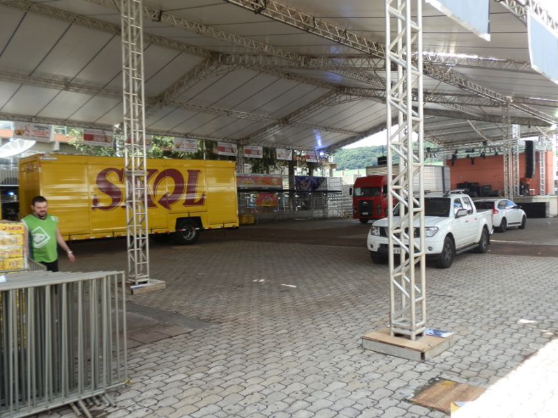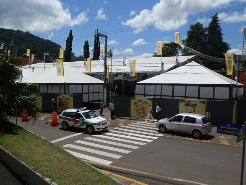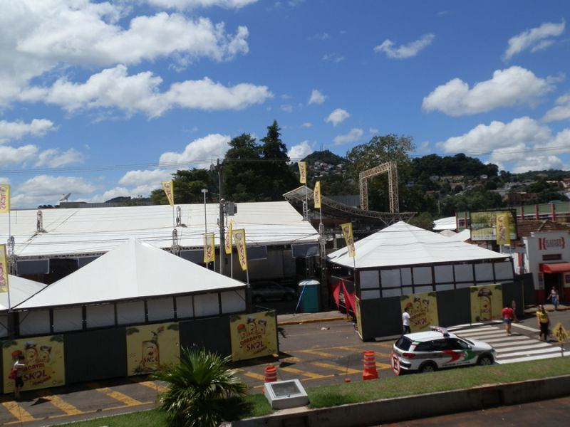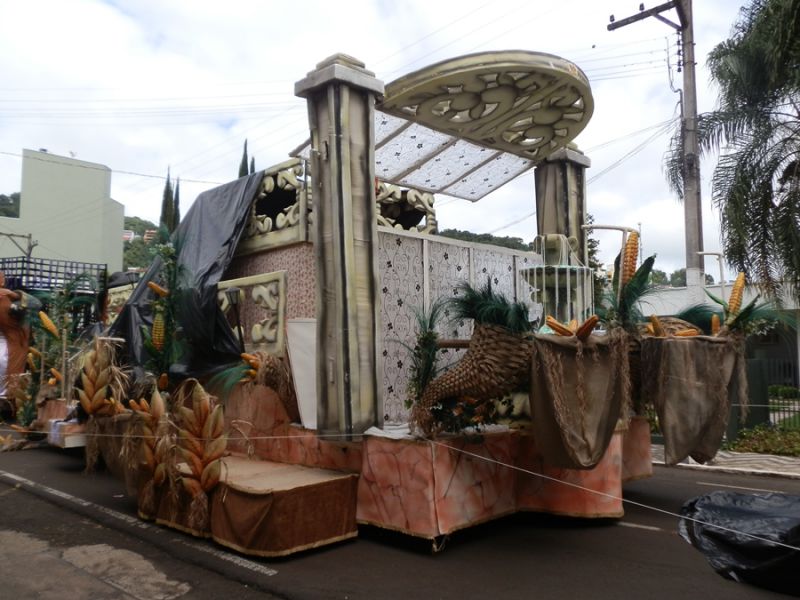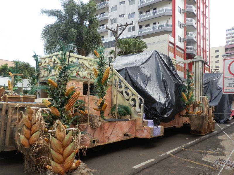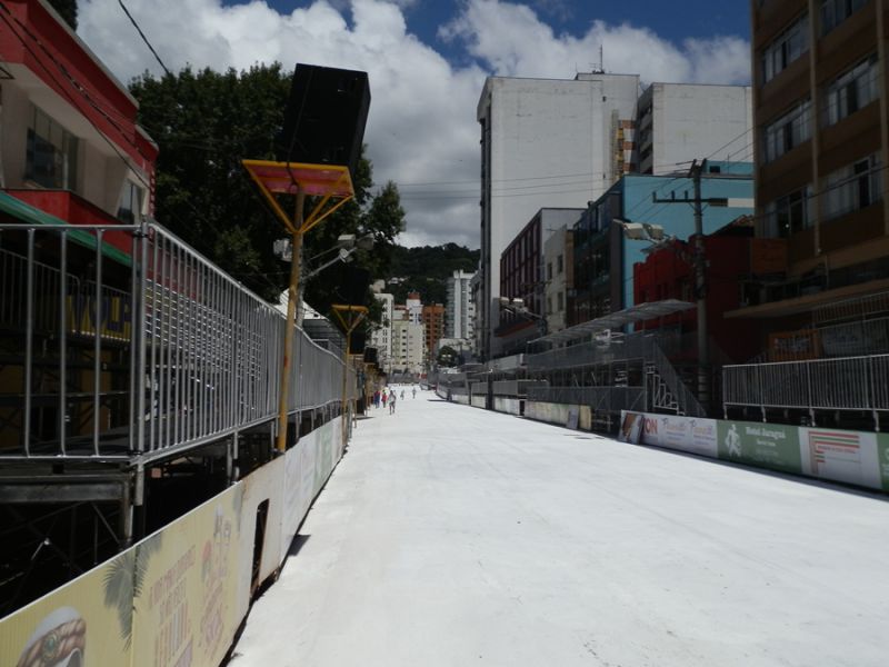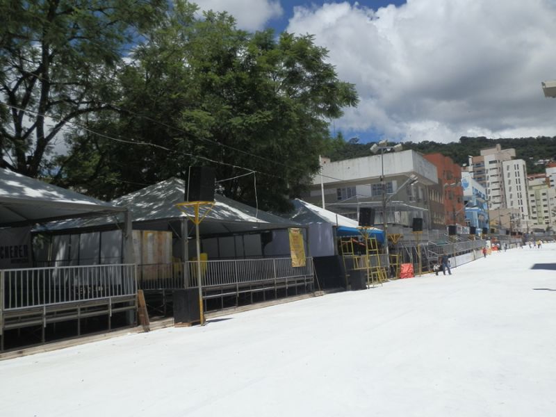 28/02/2014 A XV de Novembro, a principal avenida no coração de Joaçaba, se transformou numa grande passarela por onde vão desfilar quatro Escolas de Samba. A estrutura que toma conta do trecho entre o Hemosc e o Edifício Pedrini foi montada por uma empresa do Paraná. Em razão de normas rígidas de segurança houve uma redução do número de camarotes e também de arquibancadas. O trânsito sofreu alterações significativas por causa da interdição da XV. A PM pede para que os motoristas fiquem atentos e trafeguem com muita paciência observando a sinalização. Os carros alegóricos, que deverão novamente encher os olhos do público, já foram deslocados dos barracões e estão concentrados em vias próximas da passarela do samba.
