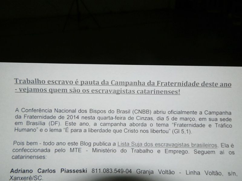 07/03/2014 A Câmara de Vereadores de Herval d' Oeste realizou sessão solene na noite desta quinta-feira (06) para marcar o lançamento da Campanha da Fraternidade deste ano no município. O evento ocorreu no pavilhão da igreja Senhor Bom Jesus. A campanha da fraternidade deste ano tem como tema “Fraternidade e Tráfico Humano”, com o lema “E para a liberdade que Cristo nos libertou”. A sugestão do pároco padre Davi Lenor para realização da sessão foi acatada pelo presidente do Legislativo hervalense, Juarez Antônio de Souza, após ser aprovada pelos demais vereadores.