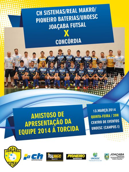 11/03/2014 O CH Sistemas/Real Makro/Pioneiro Baterias/Unoesc Joaçaba Futsal realiza o primeiro amistoso do ano diante da sua torcida nesta quinta-feira (13), às 20h, no Centro de Eventos da Unoesc (campus I). O adversário é a equipe de Concórdia, que é vice-campeã da Liga Futsal 2013 e também disputará a Divisão Especial 2014. Na oportunidade será apresentado o elenco para a temporada: os goleiros Adilson, Guilherme e Alan; os alas Juninho, Leanderson, Leonardo, Topeira, Turmena e Winicíus; os alas/pivô Geovani Fuska, Alan e Matheus; o fixo Zé Henrique; os fixos/ala Carlos Henrique, Jean e João; e o pivô Buguinha. Os torcedores também vão conhecer os patrocinadores e a comissão técnica, que continua a mesma do ano passado, formada pelo treinador Nei Tesser, o auxiliar técnico Marlon Roque, o supervisor Cassiano Klein, o preparador físico Michel Petri e o preparador de goleiros Ricardo Padilha.
