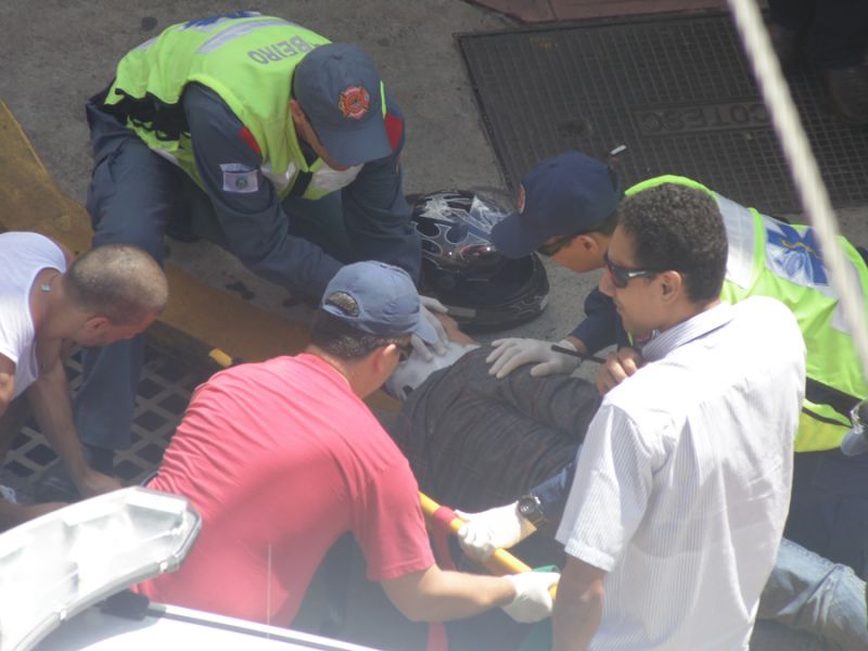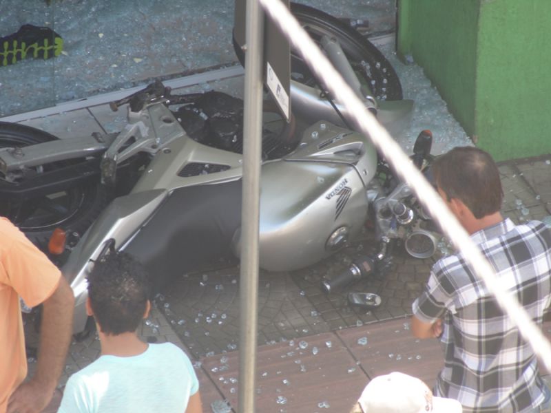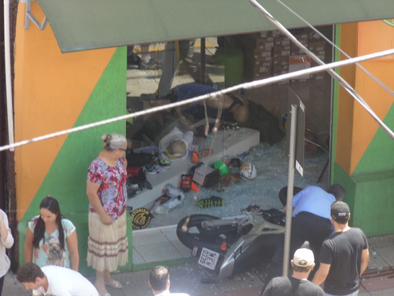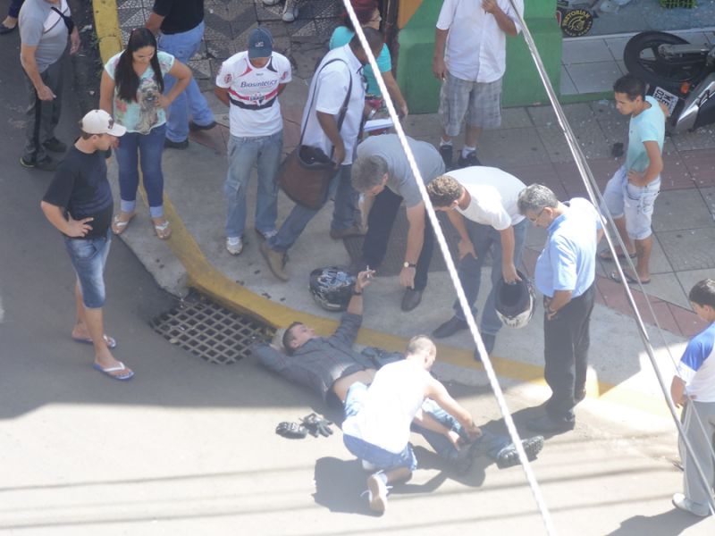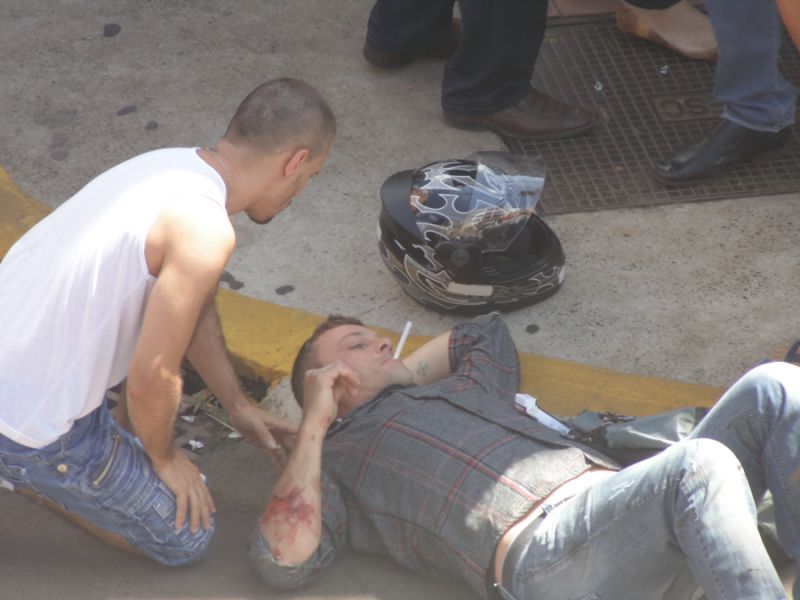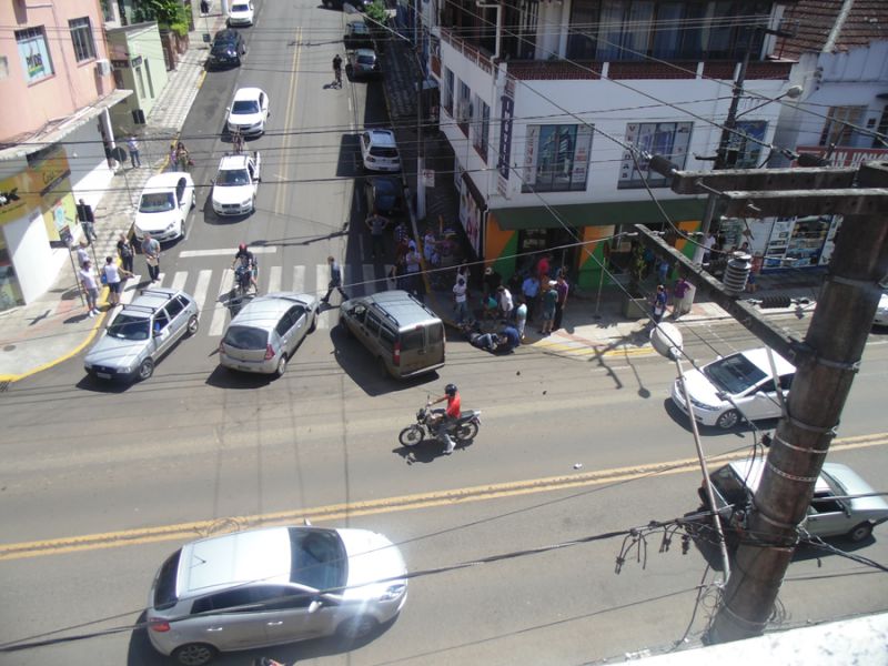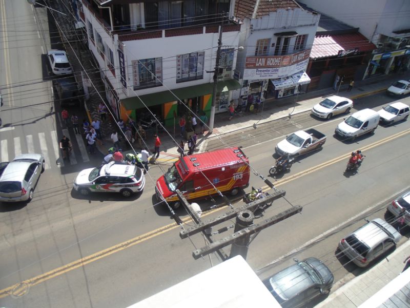12/03/2014 Uma colisão na manhã desta quarta-feira (12) na XV de Novembro em Joaçaba, em frente a Rádio Catarinense, deixou um motociclista ferido. A moto, com placas de Chapecó, fazia sentido antiga rodoviária ao centro, quando foi atingida por um Renault Sandero de Joaçaba. O veículo, que se deslocava no sentido contrário, teria cortado a frente da Moto para entrar na rua 13 de Maio. Com a colisão a moto foi arremessada contra a vitrine de uma loja que fica no prédio localizado na esquina. O motociclista, José Marcos Schimitz, 34 anos, sofreu ferimentos na perna e no braço direito. A vítima, antes de ser socorrida pelo Corpo de Bombeiros e levada ao Hospital Universitário Santa Terezinha (HUST), surpreendeu os populares que tentavam ajudar. Caída no chão, levou a mão no bolso, tirou um cigarro e aguardou a chegada das ambulâncias. O acidente, por volta das 11h30, deixou o trânsito lento na XV de Novembro.