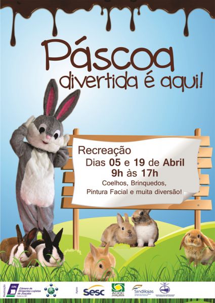 27/03/2014 A Páscoa deste ano em Joaçaba será celebrada com uma programação especial em dois finais de semana. A Câmara de Dirigentes Lojistas (CDL) firmou parceria com o SESC, ACIOC, Sindilojas e o Sindicato dos Empregados no Comércio para viabilizar o projeto “Páscoa é Aqui”. Nos dias 05 e 19 de abril (sábados) a praça Adolfo Konder em frente a prefeitura será transformada numa grande área de lazer com muitos atrativos para as crianças. Colaboradores das entidades parceiras estarão realizando pinturas faciais temáticas, distribuindo orelhas de coelho e fotografando as crianças. O evento será animado por dois “coelhos” e pelo mascote da CDL. Também será colocado a disposição brinquedos. Nos dois sábados as lojas estarão atendendo o público no horário das 09 às 17h sem fechar ao meio dia.