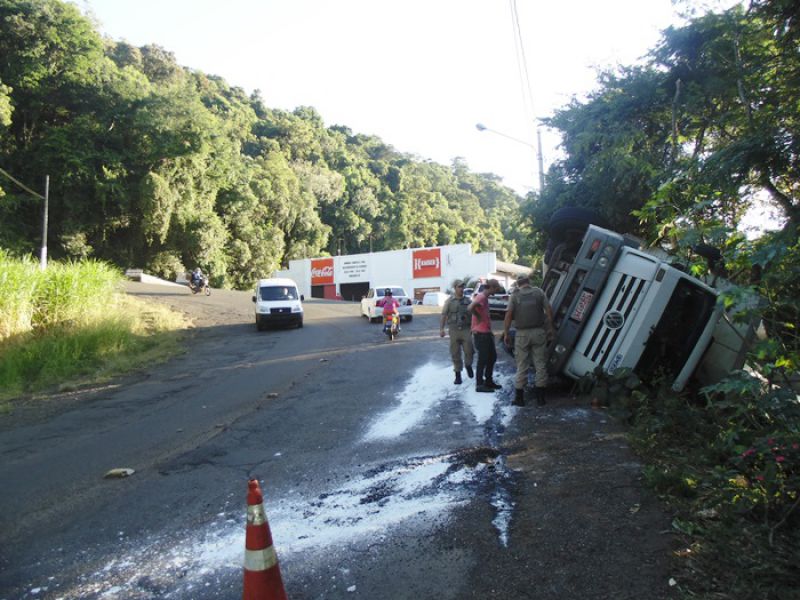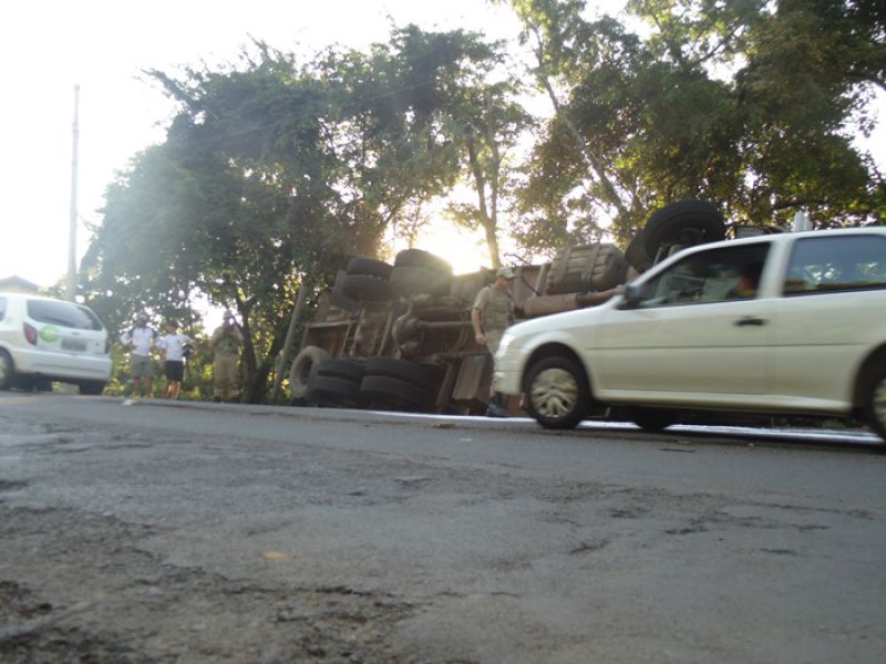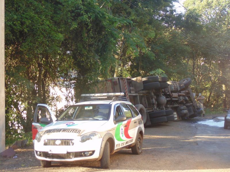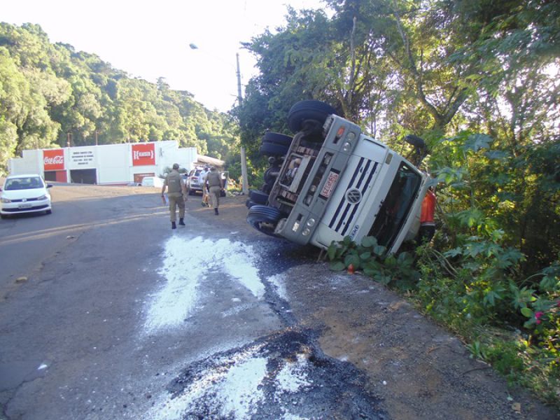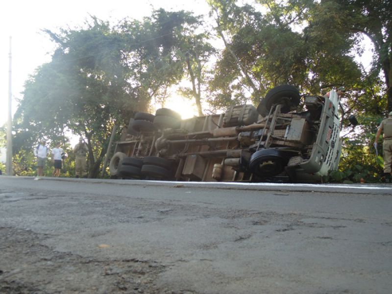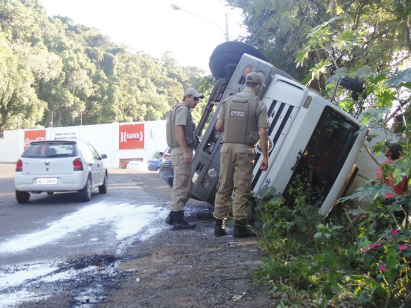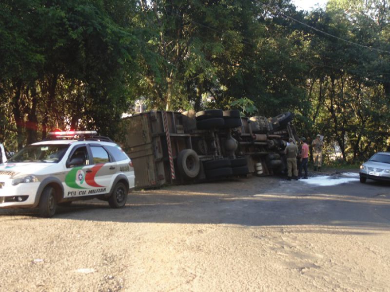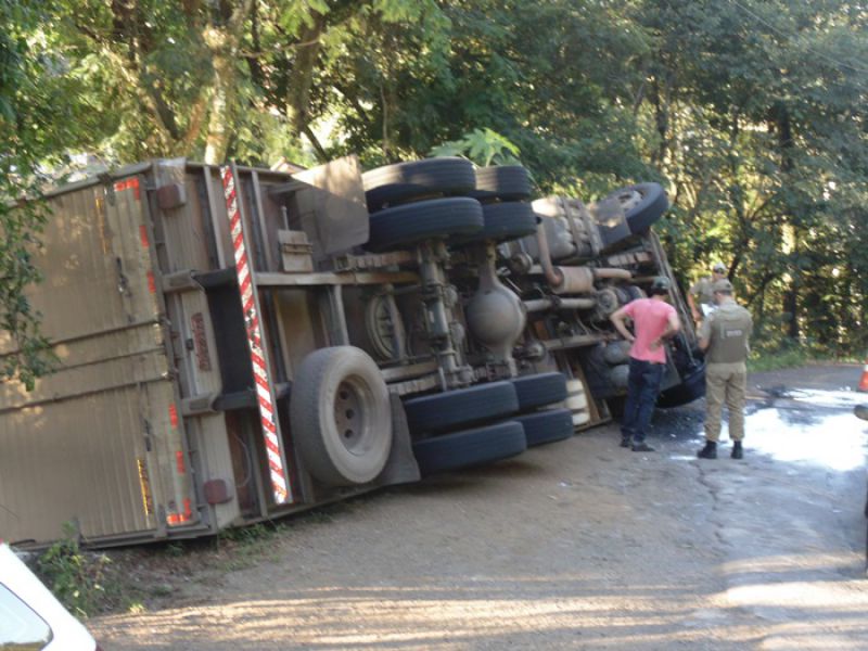 27/03/2014 Um caminhão carregado de sal tombou na tarde desta quinta-feira (27) no acesso Adolfo Zigueli em Joaçaba. O acidente ocorreu por volta das 16h45 em uma curva acentuada em frente a uma distribuidora de bebidas. Volkswagen placas MCY-2941 de Iporã do Oeste descia o acesso em direção ao Centro da cidade quando o motorista, Cléberson Zanchetti, de 22 anos, acabou perdendo o controle da direção. Segundo ele o caminhão ficou sem freio. O caminhão ficou fora da pista, apenas com parte da traseira no acostamento, não oferecendo risco aos usuários da via. A Polícia Militar sinalizou o local. Zanchetti sentia dores no joelho, e dispensou o atendimento no hospital. O Corpo de Bombeiros foi acionado para jogar cal na pista sobre o óleo que vazou do caminhão. De acordo com o soldado Fernando César, a documentação do caminhão e a carteira de habilitação do motorista estão em dia. Parte da carga caiu do baú. O restante deverá ser transferido para outro caminhão. A remoção do caminhão será feita por um guincho da seguradora da cidade de Chapecó.