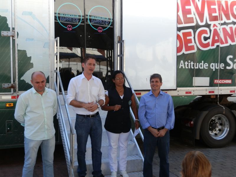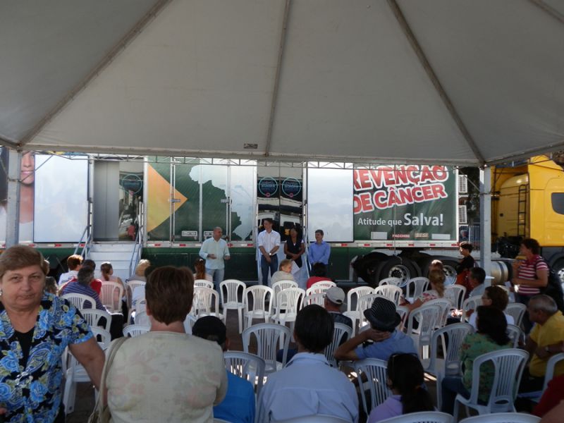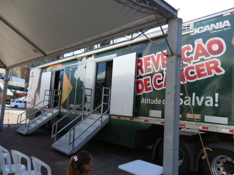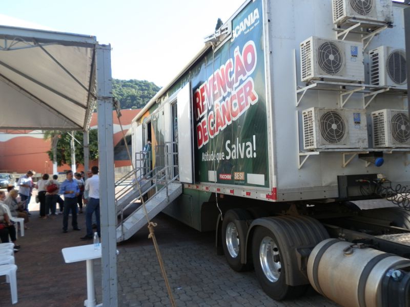 28/03/2014 A Carreta do Câncer do hospital de Barretos (SP) chegou ao município de Joaçaba na manhã desta sexta-feira (28). O consultório móvel está percorrendo todo Sul do Brasil com objetivo de detectar casos de câncer de forma precoce, medida que pode salvar vidas já que o tratamento tardio em muitos casos pode levar a morte. A Carreta está atendendo a população joacabense na praça da Catedral, mas apenas pacientes que foram previamente agendados pelos ESFs. Pela manhã foram realizadas consultas e no período da tarde exames e até pequenas cirurgias. A equipe de profissionais que está em Joaçaba é composta por 7 pessoas. Além de dois motoristas, são 1 médico, 1 enfermeira e três técnicos de enfermagem. Para Joaçaba foram destinados 130 atendimentos nas especialidades de pele, próstata e cólo de útero. Nos casos suspeitos de câncer o material será coletado e levado para São Paulo. O resultado sairá em 40 dias.