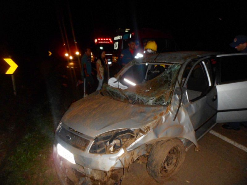 29/03/2014 Um carro capotou na madrugada deste sábado (29) na BR-282 em Joaçaba. O acidente ocorreu por volta das 2h na “Curva da Marta” e envolveu um Ford Fiesta com placas de Catanduvas (SC), conduzido por um jovem de 19 anos, tendo na carona outros dois jovens, um de 20 e um de 23 anos. Todos apresentavam escoriações e foram conduzidos pelo Corpo de Bombeiros ao Hospital Universitário Santa Terezinha. Os bombeiros fizeram ainda o desligamento da bateria do veículo e a limpeza da pista. A Polícia Militar também esteve no local, bem como a Polícia Rodoviária Federal para o levantamento dos dados da ocorrência.