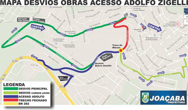 09/04/2014 A prefeitura de Joaçaba divulgou na manhã desta quarta-feira (09) um mapa que mostra as rotas de desvios de trânsito durante as obras de duplicação do acesso Adolfo Ziguelli. A grande preocupação dos usuários é quanto a utilização de vias alternativas em função do bloqueio total de tráfego de veículos. Porém, a empresa responsável informou que o bloquei se dará apenas na primeira etapa. Nas demais fases da obra o tráfego será sempre controlado em meia pista. A primeira orientação é para que todos os motoristas busquem e tracem rotas alternativas afim de já ter definido seus novos itinerários e evitar transtornos maiores nos primeiros dias de restrição de tráfego. Como principal desvio ficou definido a Rua Amábile Falavinha, que corta todo o bairro Anzolin e chega até a Rua Antonio Nunes Varela no bairro Vila Pedrini. Essa Rua está em fase final de pavimentação e sua conclusão é que definirá exatamente a data de fechamento de tráfego do primeiro trecho. A interdição, da primeira fase da obra, deverá ocorrer nos próximos dias.