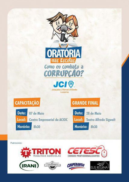“O Projeto Oratória nas Escolas é um uma forma de incentivar a reflexão dos jovens sobre a corrupção e um estímulo para que cada indivíduo da sociedade seja responsabilizado pelo combate a esse tipo de prática. O tema, determinado pela JCI Brasil, vem ao encontro do projeto nacional de combate à corrupção do Ministério Público”, disse a presidente da JCI Joaçaba/Herval d' Oeste/Luzerna, Schaila Bucco.