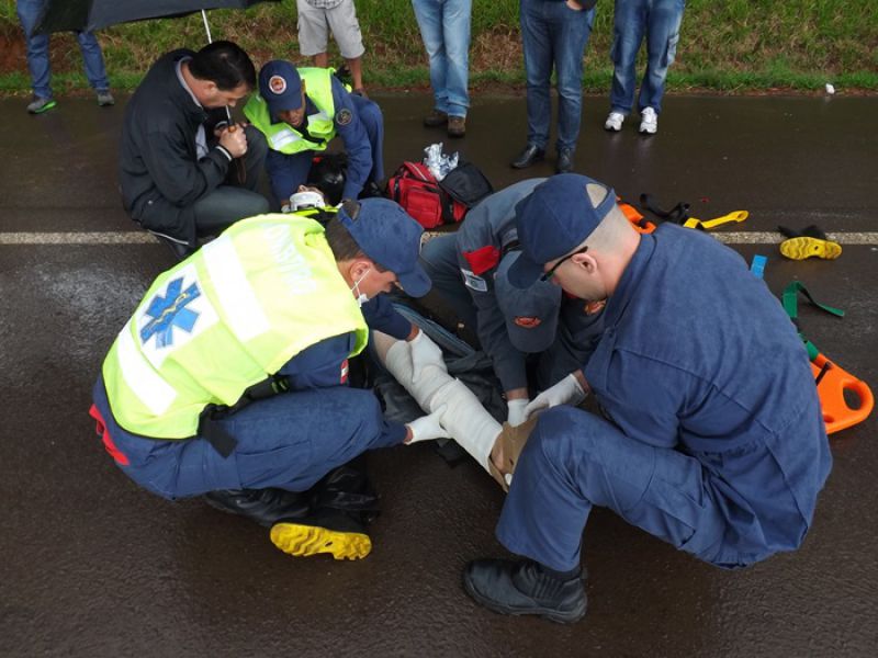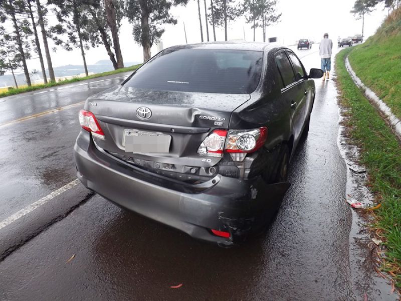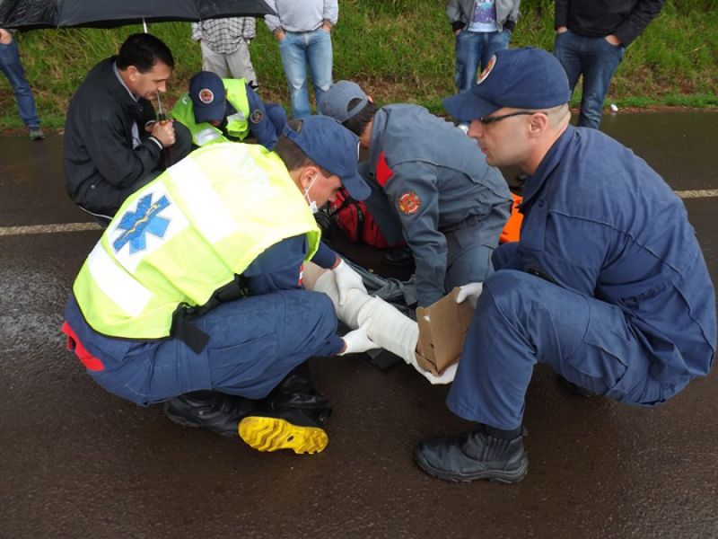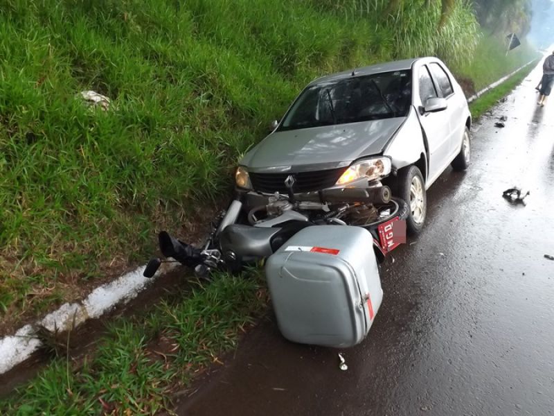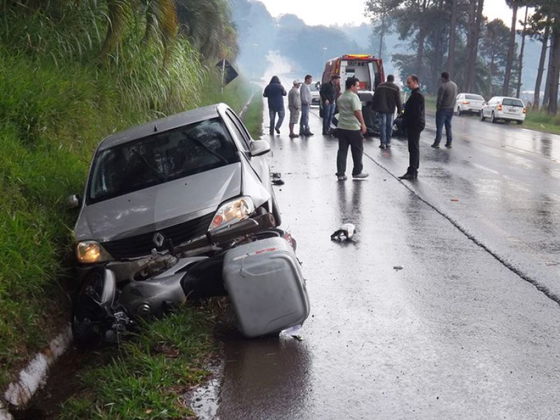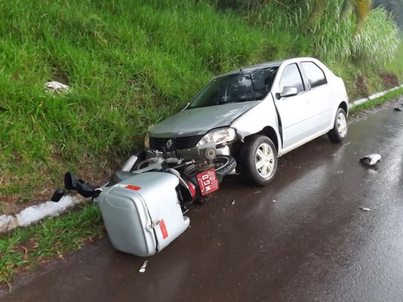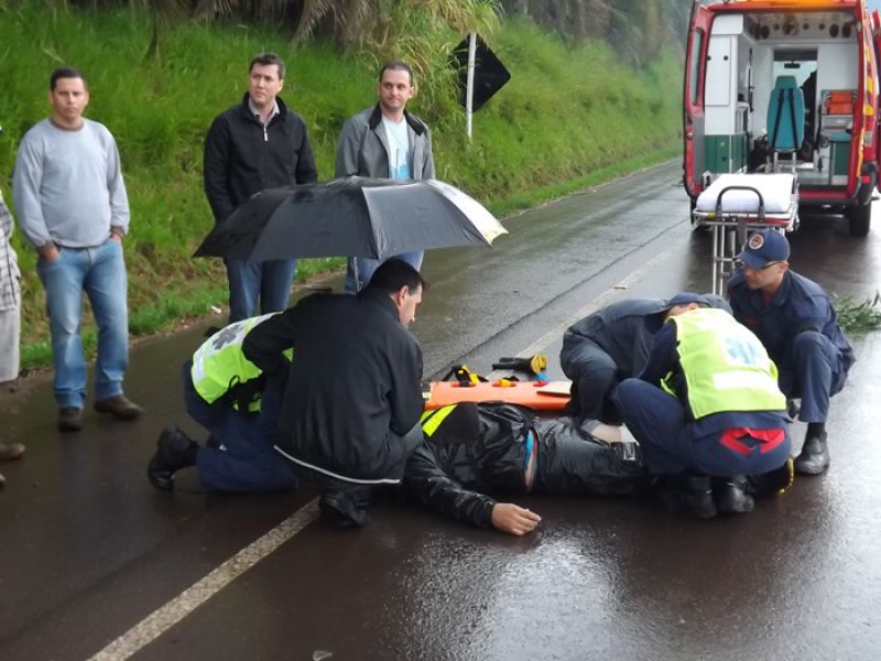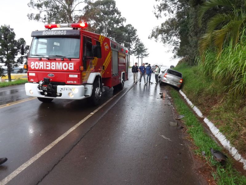 21/05/2014 Uma colisão envolvendo moto e dois carros foi registrada na manhã desta quarta-feira na BR-282 em Joaçaba, próximo ao trevo de acesso ao Distrito Industrial. O acidente foi por volta das 9h. A pista estava molhada. Os veículos faziam sentido Catanduvas/Joaçaba. Segundo informações uma caminhonete teria freado repentinamente. Na sequência estava um Toyota Corolla placas de Cunha Porã/SC. Na traseira dele bateu uma moto Honda placa de Concórdia/SC, usada para frete. O condutor de um Logan placas de São José dos Pinhais/PR não conseguiu segurar e arrastou a moto por alguns metros. O motorista do carro do Paraná disse que tentou desviar jogando o carro no barranco, mas não foi possível. O motociclista ficou caído no meio da pista. Ele foi atendido pelo Corpo de Bombeiros. Ele foi imobilizado e conduzido ao Hospital Universitário Santa Terezinha com escoriações e suspeita de fratura na perna esquerda. Os demais envolvidos não se feriram. A Polícia Rodoviária Federal fez o levantamento das informações para tentar apurar as causas do acidente.