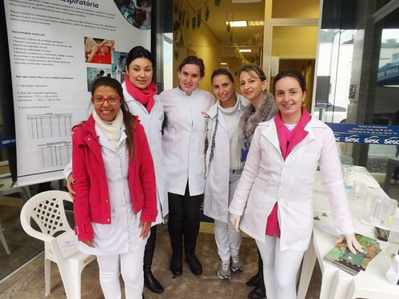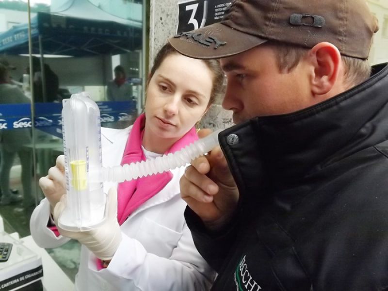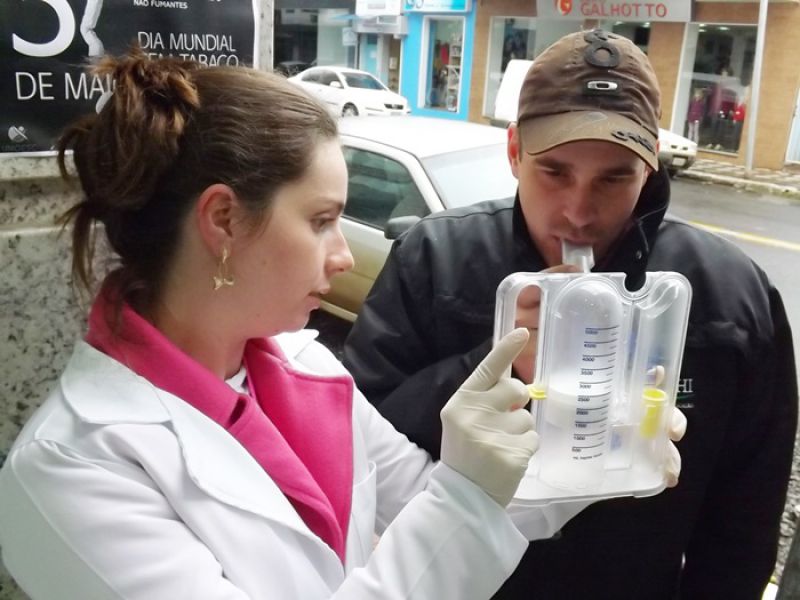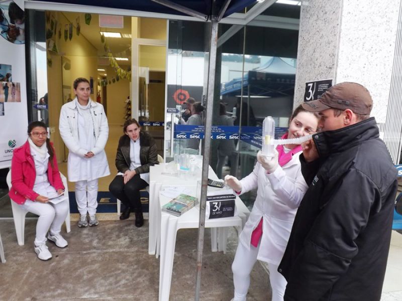 31/05/2014 O Sesc e o curso de Fisioterapia da Unoesc realizaram na manhã deste sábado (31) atividades alusivas ao Dia Mundial sem Tabaco. Nem mesmo a chuva atrapalhou a programação que foi desenvolvida em uma tenda montada em frente ao Sesc. Foram fornecidas orientações, teste de mensuração da capacidade inspiratória, recolhidas carteiras de cigarro através de uma caixa de coleta e distribuição de material informativo sobre os malefícios do cigarro. As pessoas passavam pelo local, faziam o teste e recebiam as orientações gratuitamente. De acordo com a coordenadora do curso de Fisioterapia da Unoesc, Chrystianne Saretto, os problemas respiratórios decorrentes do tabaco e até mesmo da oscilação de temperatura são preocupantes na região de Joaçaba. Ela destaca que o curso tem sido procurado frequentemente para desenvolver parcerias e atividades pedagógicas. A coordenadora de Educação e Saúde do Sesc, Liliana Dagostini, ressalta que mensalmente são feitas ações junto à comunidade. A última foi voltada à Saúde da Mulher e agora as orientações para os fumantes no intuito de minimizar o consumo ou até mesmo estimular as pessoas a pararem de fumar. Ela informa que há um cronograma de atividades previstas relacionadas à área para o mês de junho.