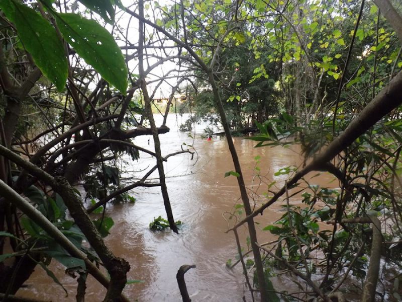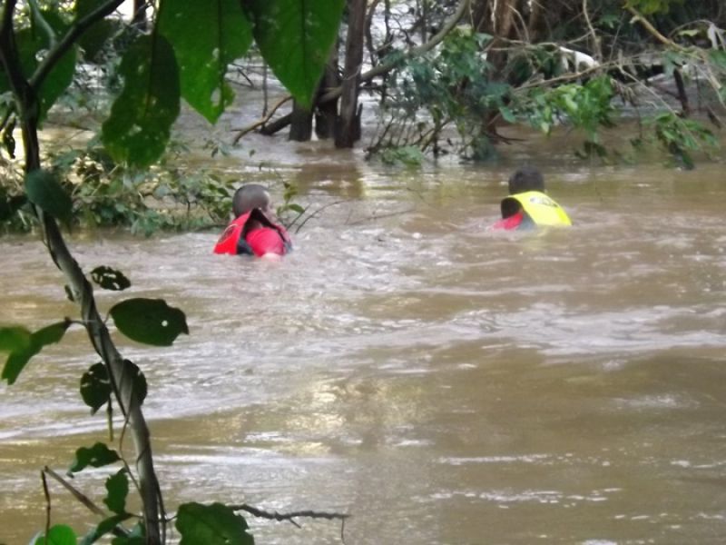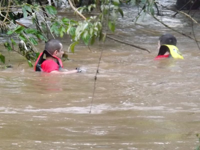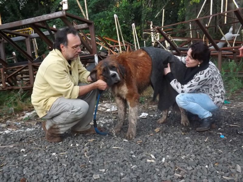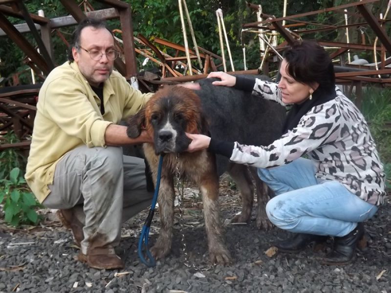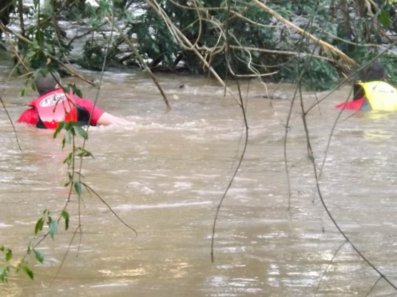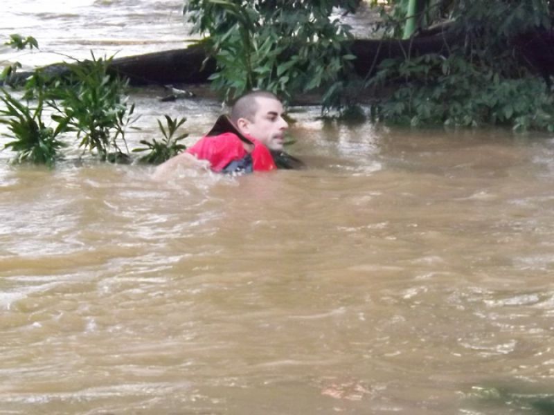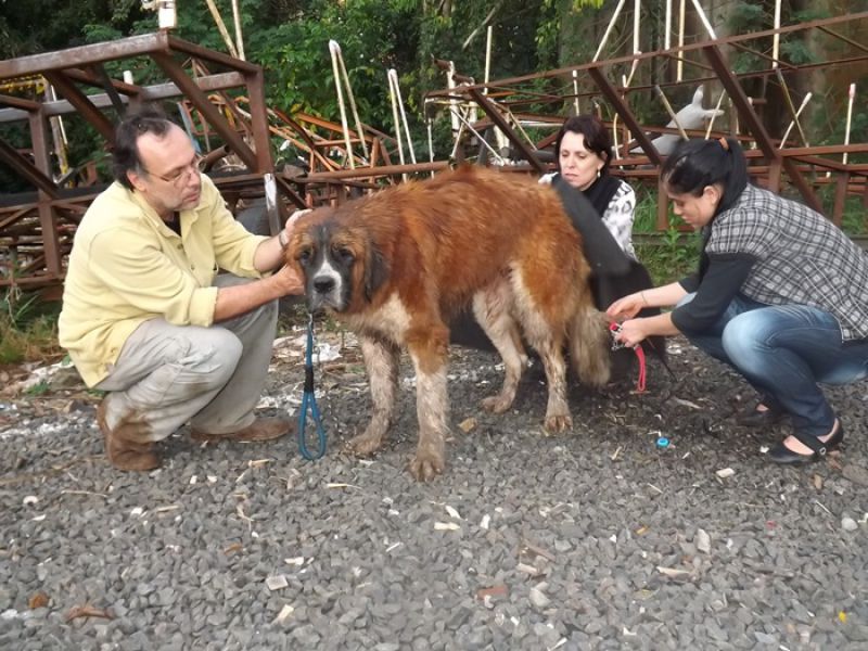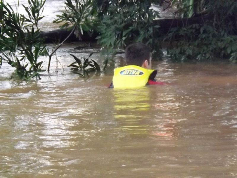 09/06/2014 Um cão da raça São Bernardo pesando 100 quilos foi retirado das águas do Rio do Peixe em Joaçaba depois de ficar cerca de quatro horas ilhado no início da tarde desta segunda-feira (09). O animal de nome Rebeca com dois anos de idade pertence à família de Maurício Grando que reside no bairro Santo Antônio em Herval d' Oeste, em frente ao parque de máquinas da prefeitura. Segundo o proprietário do cão, Rebeca é dócil e tem o hábito de brincar com capivaras que saem do rio e vão pastar no pátio da residência. Porém, nesta segunda depois que as capivaras entraram na água, por volta das 13h30, a cadela foi atrás, mas devido ao nível elevado do rio e à forte correnteza acabou sendo arrastada pela água. Rebeca foi parar numa distância aproximada em linha reta de dois quilômetros, nos fundos da AABB em Joaçaba. Rebeca ficou presa em galhos de uma ilha e começou a latir, chamando a atenção de populares que acionaram o Corpo de Bombeiros. Dois mergulhadores foram ao local pela rua Roberto Trompowski. O dono e a mulher dele acompanharam o resgate. Os bombeiros nadaram até o animal usando coletes salva-vidas e cordas. A forte correnteza e o peso do animal dificultaram a ação de salvamento e levaram cerca de uma hora para retirar Rebeca da água, por volta das 17h. Ela estava apenas cansada, mas sem ferimentos.