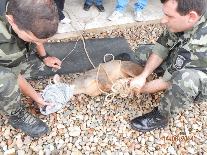 14/06/2014 Um veado foi capturado pela Polícia Militar Ambiental de Herval d' Oeste após entrar numa residência em Campos Novos. O fato ocorreu na manhã deste sábado (14) na rua Borges de Medeiros, próximo ao CAIC. A espécie Mazama gouazoubira chamada de “Veado Catingueiro” deu trabalho para os policiais ambientais no resgate. O chamado de auxílio foi feito pelo proprietário da residência por volta das 10h. “Já foram registrados alguns incidentes onde pessoas ficaram feridas quando tentavam apanhar esse tipo de animal”, disse o policial Remerson Ribeiro. O veado, assustado, acabou batendo em móveis quebrando uma vidraça da casa e se feriu, espalhando rastros de sangue pelo chão. Porém, após ser imobilizado o veado teve os pequenos ferimentos tratados e foi solto em uma floresta no município.