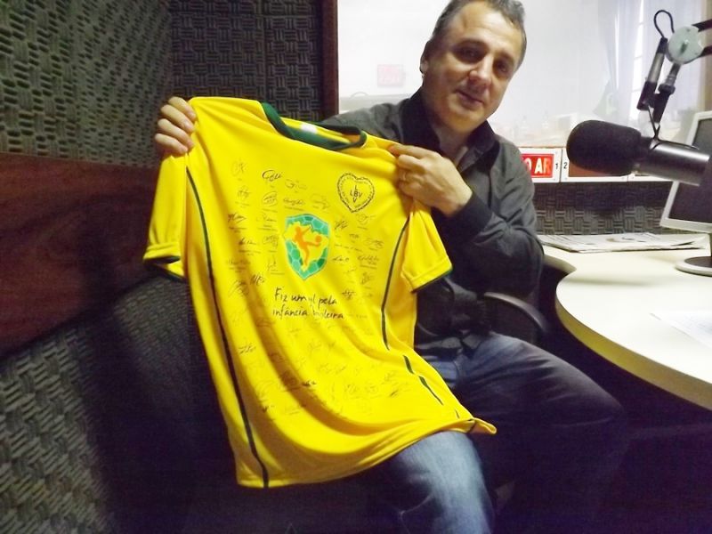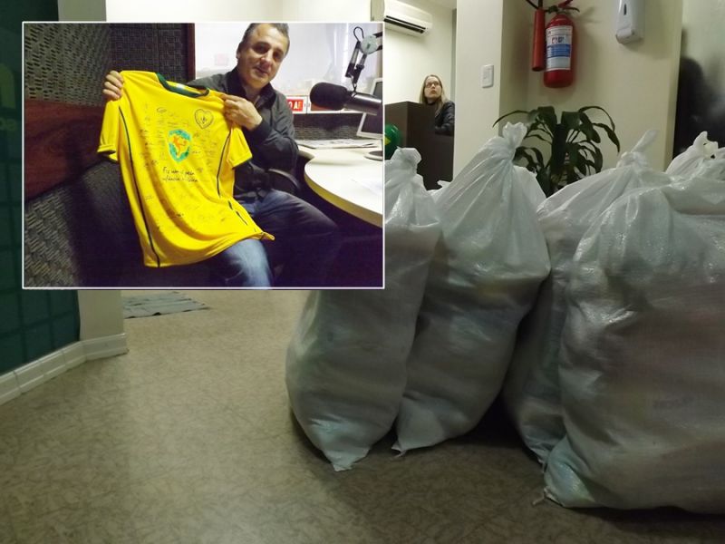 24/06/2014 Um empresário de Capinzal venceu o leilão beneficente promovido pela Rádio Catarinense e marcou um verdadeiro gol de solidariedade ajudando pelo menos 10 famílias carentes. O empresário Ademir Miola arrematou uma camisa autografada por craques da Seleção Brasileira dando o lance de 10 cestas básicas. O leilão foi promovido pelo programa Rádio Contato que vai ao ar de segunda a sexta-feira das 18 às 19h. Durante 30 dias os lances estiveram abertos. Na manhã desta terça-feira (24) o empresário saiu de Capinzal e veio até Joaçaba entregar as cestas básicas e retirar a camiseta, que foi doada pela Legião da Boa Vontade (LBV). A entrega aconteceu ao vivo no programa da Alegria, apresentado por Amarildo Monteiro. As cestas básicas doadas a Rádio Catarinense serão repassadas em número de oito para a Casa da Amizade e duas para a campanha que está sendo realizada pelo Rotary Club em benefício às vítimas da enchente no Norte do Estado, onde centenas de pessoas permanecem desalojadas.
