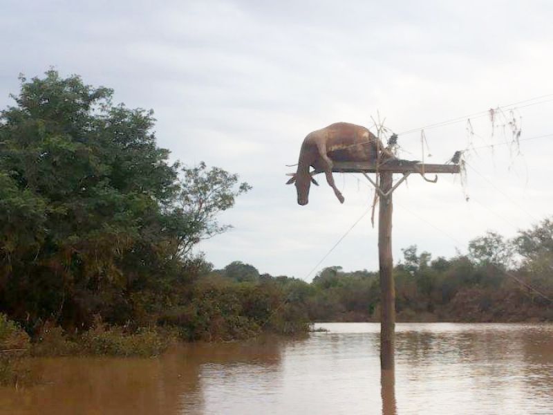 08/07/2014 Uma imagem impressionante que mostra a magnitude da enchente no Rio Grande do Sul. No registro feito por Ricardo Giacomoli, uma vaca, que foi arrastada pelas forças das águas em São Borja, foi encontrada em cima de um poste. O animal foi encontrado depois que o rio baixou e virou ponto de grande observação de curiosos com a impressionante cena.