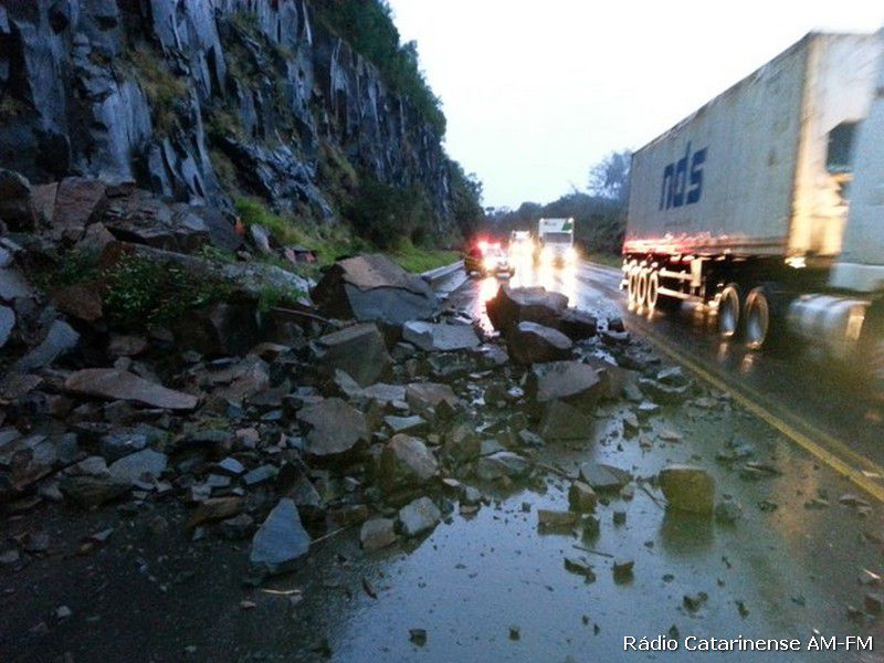 24/07/2014 Por volta das 6 horas desta quinta-feira, 24, um desmoronamento de pedras foi registrado na BR-282, que acabou deixando o trânsito em meia pista no município de Erval Velho, além de ter sido registrada uma grande fila de veículos nos dois sentidos da pista. De acordo com a Polícia Rodoviária Federal de (PRF) de Campos Novos, as pedras caíram no sentido oeste do km 361,7 da rodovia, mas ninguém ficou ferido. Conforme ainda informações da PRF, o desmoronamento foi causado devido as chuvas.