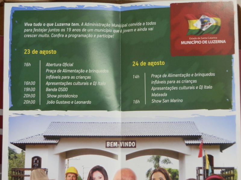 08/08/2014 A administração de Luzerna divulgou a programação oficial do aniversário de 19 anos do município que será comemorado neste mês de agosto. Um folder, com toda programação, está sendo distribuído a população. As atividades vão se concentrar no Centro de Eventos São João Batista.