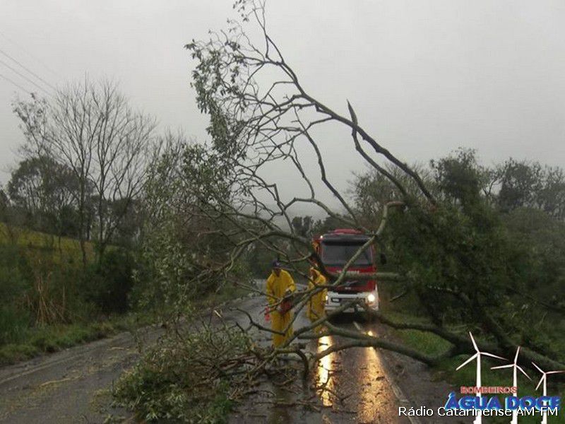 02/09/2014 A tarde desta terça-feira (2) foi de muito trabalho para os integrantes do Corpo de Bombeiros Militar de Água Doce, pois algumas ocorrências foram registradas de destelhando de casas e queda de algumas árvores em via pública. Os membros do Corpo de Bombeiro realizaram um serviço de atendimento as pessoas que foram atingidas nas ocorrências, juntamente com a Defesa Civil do município, na tentativa de amenizar a situação. Algumas pessoas ficaram assustadas com o vendaval que passou pela cidade de Água Doce.