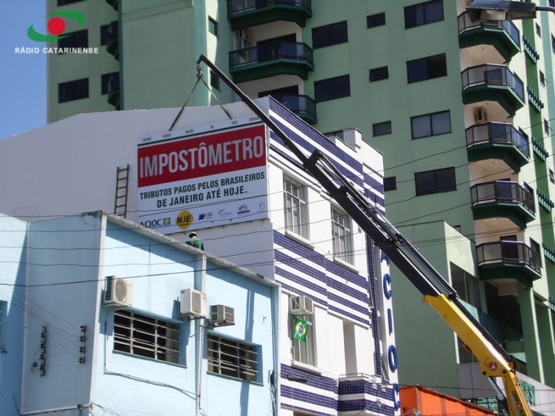 10/09/2014 Um guincho na manhã desta quarta-feira (10), no calçadão da Getúlio Vargas, no centro de Joaçaba, chamou atenção dos pedestres e motoristas. O equipamento foi utilizado pela Associação Comercial e Industrial do Oeste Catarinense (ACIO) para afixar na parede lateral do prédio da associação o Impostômetro. O painel, que custou cerca de R$ 12 mil, será inaugurado no próximo sábado, dia 13.