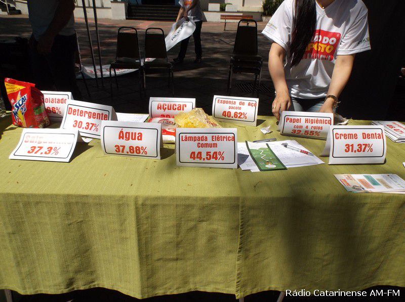 13/09/2014 Na manhã deste sábado (13) foi realizado o Feirão do Imposto defronte a Prefeitura Municipal de Joaçaba. O evento foi coordenado pelo Núcleo dos Jovens Empreendedores da Associação Comercial e Industrial do Oeste Catarinense (ACIOC). Na oportunidade os organizadores mostraram as pessoas que trafegavam pelo local, a carga tributária que incide sobre a folha de pagamento dos trabalhadores, bem como, o valor do imposto sobre alguns produtores que foram colocados à mostra.