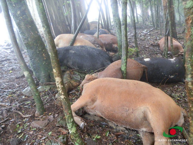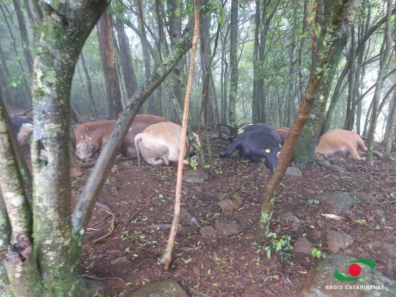 30/09/2014 A força da natureza pode ter deixado um rastro de destruição e uma cena desoladora para o proprietário de um sítio localizado no interior do município de Erval Velho. Um raio é suspeito de ter provocado a morte de 12 bovinos que estavam se protegendo num pequeno capão. O proprietário Sérgio Luiz De Sordi não soube precisar quando teria ocorrido o fato. Na manhã desta terça-feira (30) ele percebeu que seu rebanho havia diminuído. Após realizar buscas pela propriedade ele acabou se surpreendendo com a cena ao encontrar os animais mortos em baixo de árvores. Um médico veterinário foi acionado para realizar uma perícia e apontar a causa da morte dos animais. O prejuízo é superior a R$ 15 mil. Suspeita-se que eles tenham morrido a alguns dias em razão do estado adiantado de decomposição. A tese de raio ganha força em razão de uma verdadeira cratera aberta próxima do local onde estavam os animais.