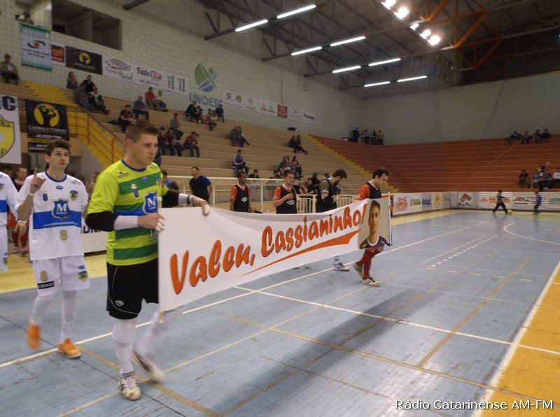 O jogo começou atípico porque a equipe da casa em poucos minutos perdia por 2 a 0 e demonstrava muito nervosismo. “Acho que a homenagem que fizemos antes do início da partida ao jogador Cassianinho mexeu com eles”, resumiu Nei Tesser. Ainda nos 20 minutos iniciais, depois de chamar a atenção do elenco, o Joaçaba Futsal foi em busca da vitória e através de Ernani e Léo conseguiu terminar o primeiro tempo empatado em 2 a 2.