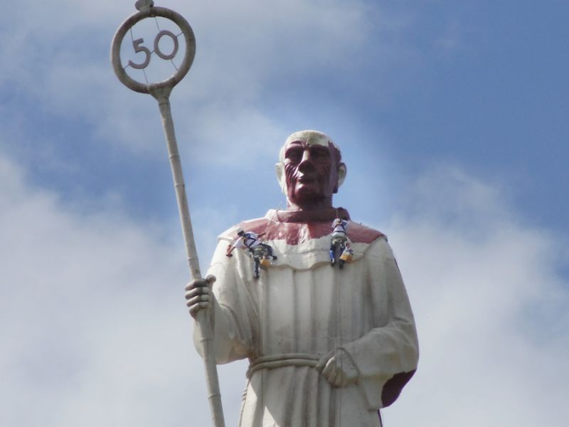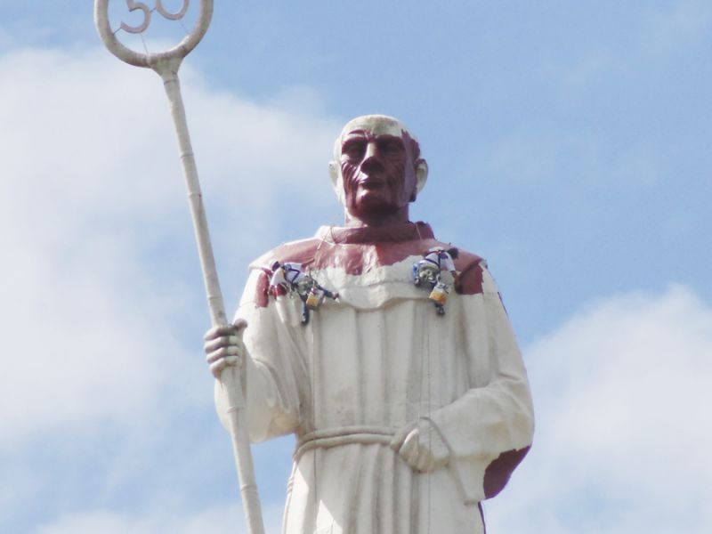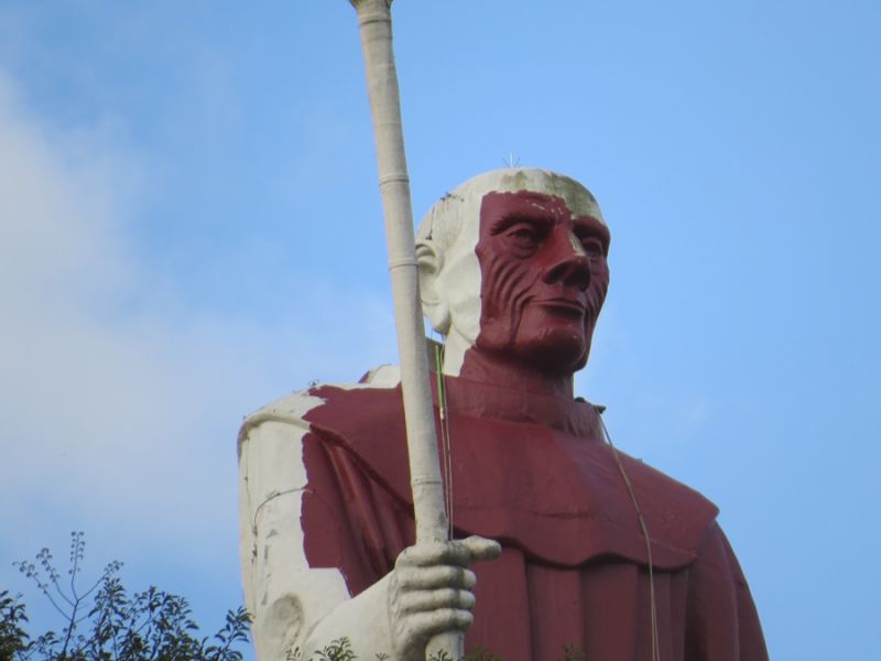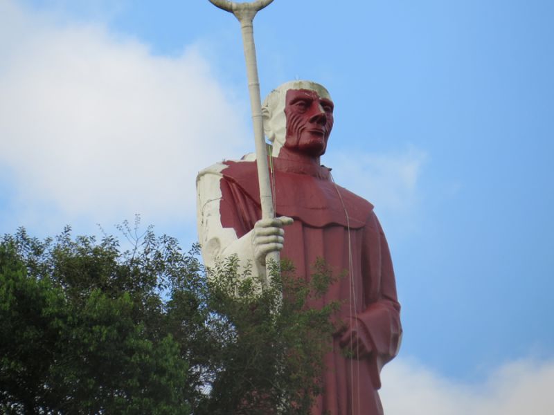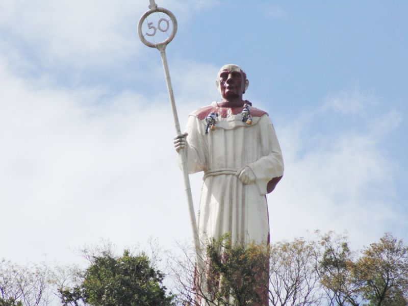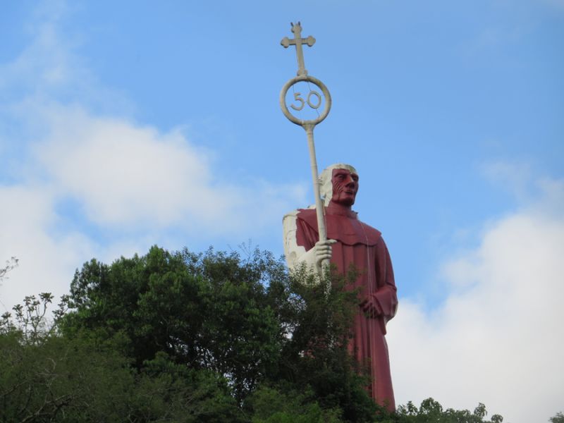 07/10/2014 A obra de revitalização do Monumento Frei Bruno prossegue dentro do cronograma de trabalho definido pela empresa Tecnoeste em conjunto com a Câmara de Dirigentes Lojistas (CDL). Dois funcionários da empresa, com uso de equipamentos especiais, já iniciaram a etapa de pintura da estátua. A pintura iniciou após a lavação e remoção da sujeira que se acumulava em grande quantidade. A empresa está aplicando um fundo com pigmentação escura e em seguida vai aplicar uma tinta branca com alta durabilidade, segundo informou o diretor da Tecnoeste Gilmar Vedvotto.