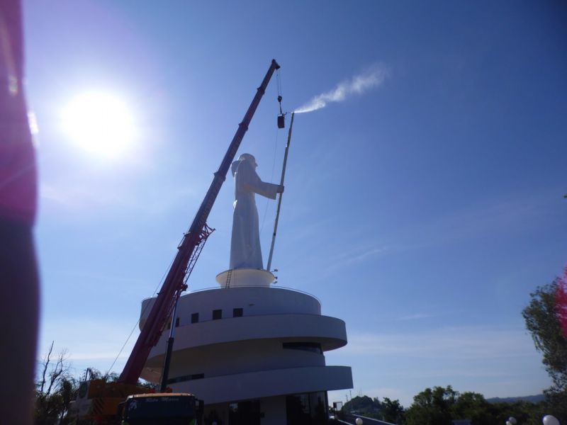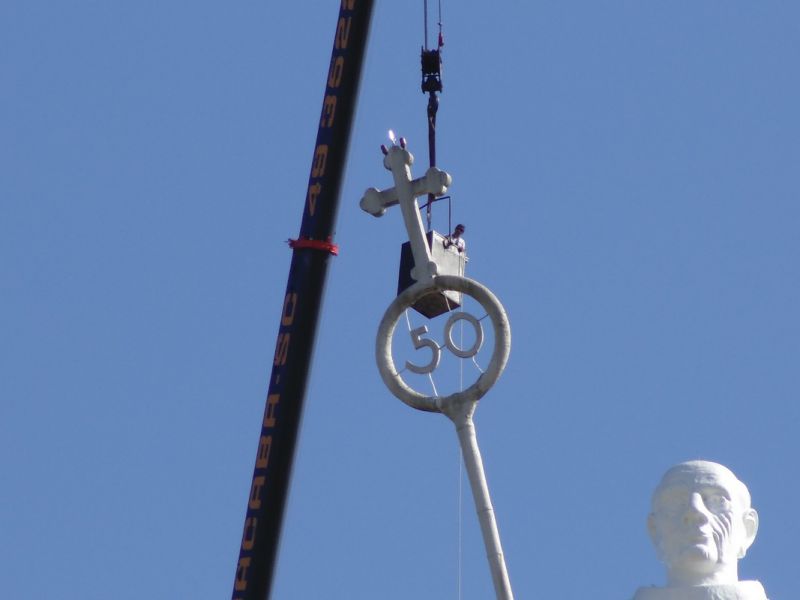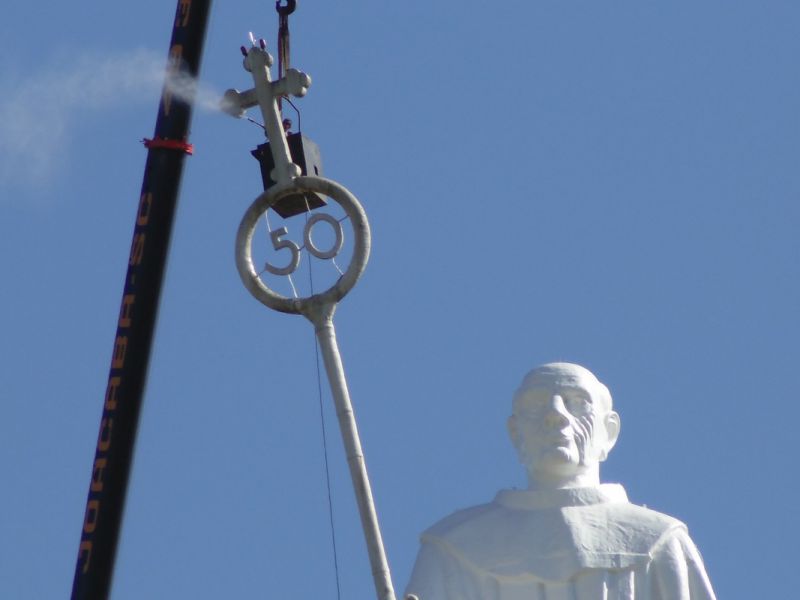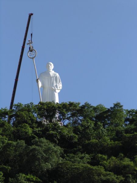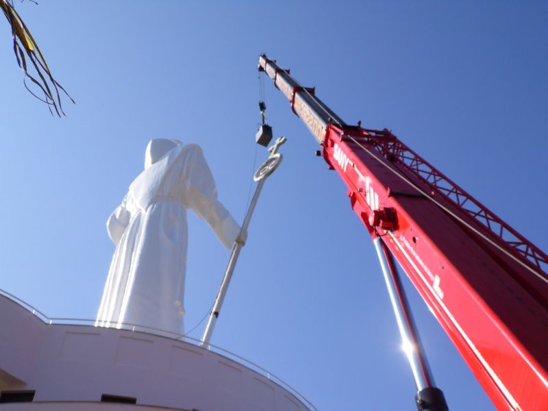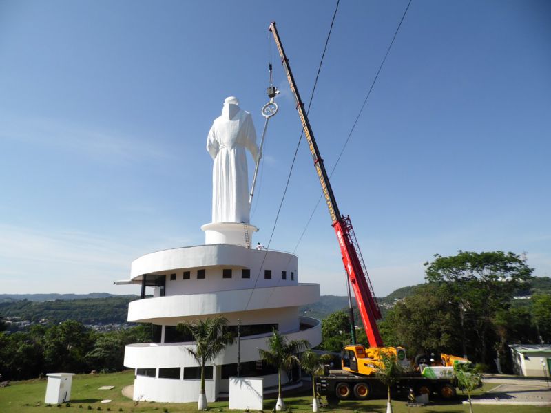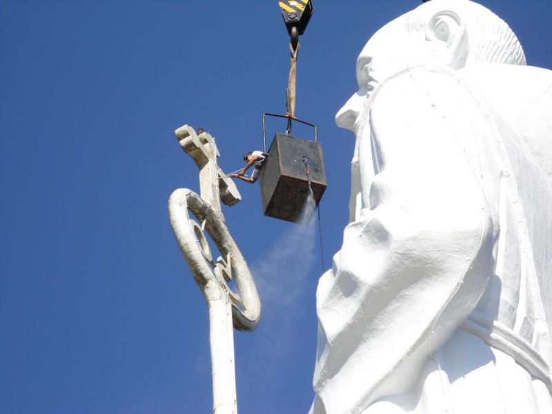 27/10/2014 A empresa contratada pela Câmara de Dirigentes Lojistas de Joaçaba (CDL) iniciou na manhã desta segunda-feira (27) uma das tarefas mais difíceis da obra de revitalização do Monumento Frei Bruno. Com auxílio de um guindaste de grande porte a empresa teve acesso e está executando a limpeza do Cajado, tarefa que deverá ser finalizada até o final da tarde. O diretor de serviços da CDL, Sérgio Bucco, explicou que ainda esta semana será aplicada mais uma demão de tinta na rampa de acesso. A última etapa será a implantação de um moderno sistema de iluminação que vai garantir uma melhor visibilidade da estátua. Na última sexta-feira (24) representantes de uma empresa especializada de SP estiveram em Joaçaba realizando alguns testes para se definir o tipo de equipamento que será usado. Se tudo correr conforme o programado a obra deverá ser finalizada até a segunda quinzena de novembro.