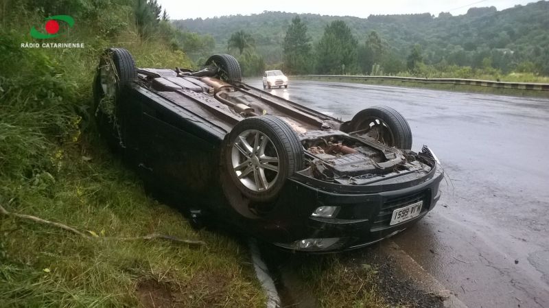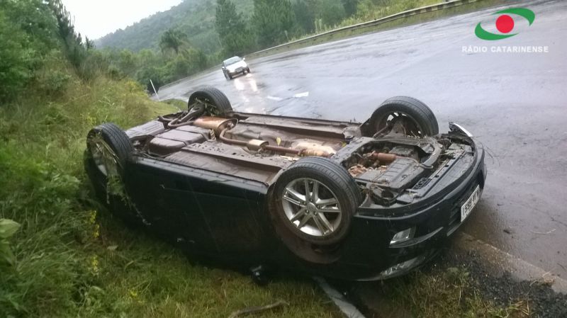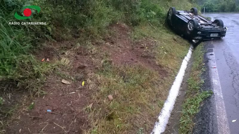 04/11/2014 Um casal de Joaçaba que se deslocava pela BR-282 na manhã desta terça-feira (04) levou um grande susto. O motorista de 24 anos perdeu o controle e o Hyundai i30, com placas de Joaçaba, saiu da pista bateu contra um barranco e em seguida capotou ficando com o rodado para cima. O acidente aconteceu por volta das 09h30 em Catanduvas numa curva em frente a uma Ervateira. O casal sofreu apenas ferimentos leves e o veículo ficou praticamente destruído. Chovia na hora do acidente. O veículo estava se deslocando sentido Joaçaba/Chapecó. Viajava junto com o motorista uma jovem de 24 anos.