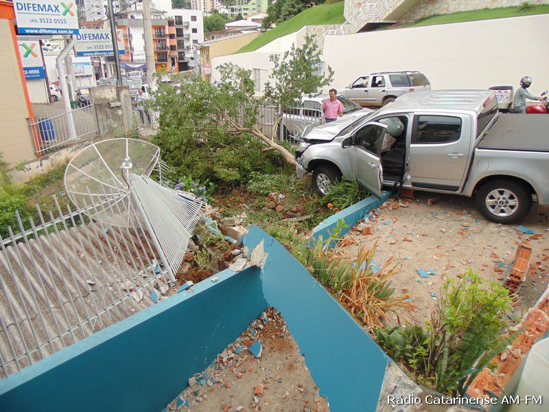 24/11/2014 O motorista de uma camionete GM/S10 levou um grande susto no final da tarde desta segunda-feira (24). O veículo, com placas de Herval d’Oeste, derrubou uma cerca com murro na empresa “Só Elétrica” na rua Duque de Caxias. O motorista relatou que perdeu o controle da camionete que descia pela rua Coronel Joaquim Torres, passou pela Duque de Caxias até parar na cerca. Por muito pouco o veículo não atingiu uma residência que fica no nível mais baixo da rua. Foram registrados apenas danos materiais.