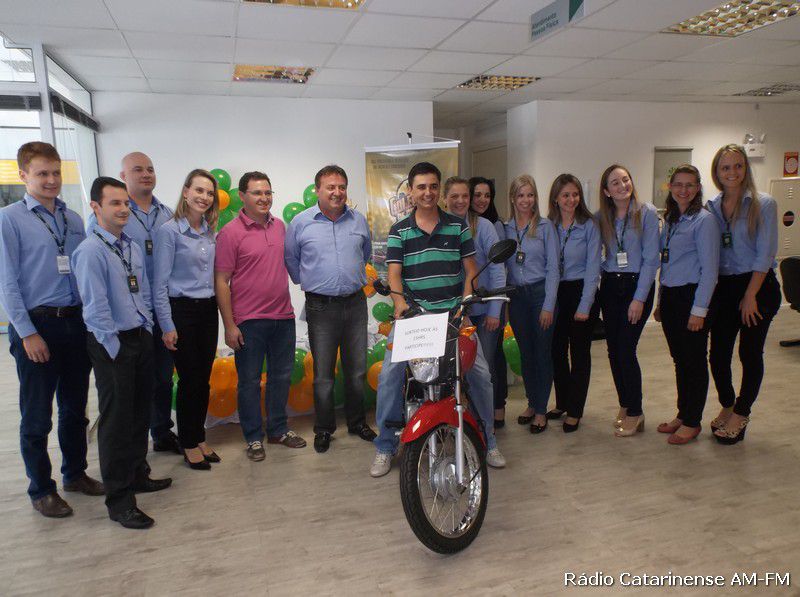 05/12/2014 Aconteceu na tarde desta sexta-feira (5), o sorteio de uma motocicleta Honda Fan CG-125 0km de cor vermelha por parte da agência do Sicredi em Joaçaba. Na presença de um grande número de convidados, funcionários e alguns clientes o garoto Matheus entrou na piscina com milhares de cupons e fez o sorteio de apenas um, cujo nome do ganhador é Juliano Luiz Turatto, que no momento do sorteio, era um dos clientes que estava dentro da agência. Todo o sorteio foi conduzido pelo gerente do Sicredi local, Roque Cazagranda.