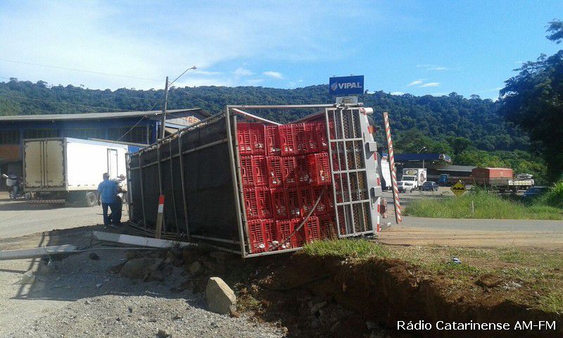 02/02/2015 Por volta das 16h30 desta segunda-feira (02), um caminhão Ford Cargo graneleiro com placas MDZ-6709 de Joaçaba, tombou no trevo do Chocodinho, quando o motorista Dieison Kosenhoski de 26 anos, fazia uma curva com destino ao município de Capinzal, onde levaria a carga de frangos.