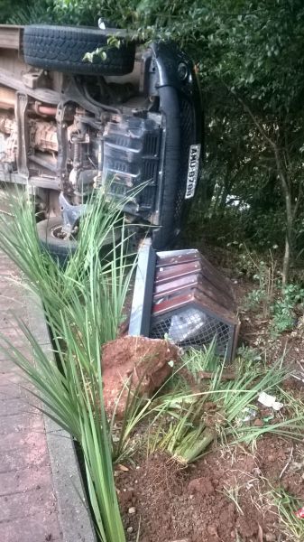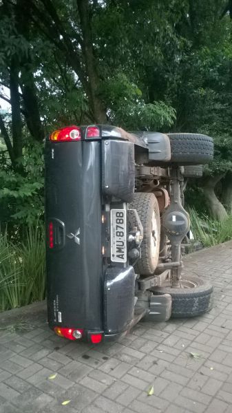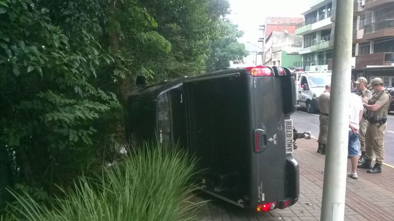 09/02/2015 Uma camionete Mitsubishi L200 Triton tombou na avenida XV de Novembro em Joaçaba no início da manhã desta segunda-feira (09). O acidente aconteceu no trecho entre a passarela Atílio Pagnoncélli e a ponte Jorge Lacerda. O veículo com placas de Joaçaba invadiu a calçada, arrancou uma lixeira e tombou. Ninguém ficou ferido nesta saída de pista. O motorista, de 19 anos, que estava se deslocando para trabalhar em Herval d’Oeste, disse que não sabe o que aconteceu, afirmando que estava transitando com velocidade compatível para o local. Por muito pouco ele não caiu no Rio do Peixe. Uma árvore evitou uma tragédia maior.