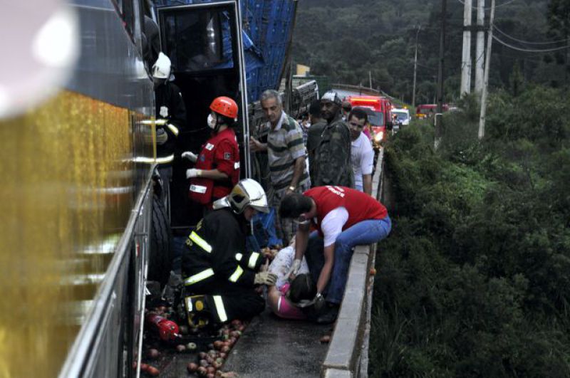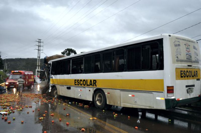 19/02/2015 Um acidente grave movimenta polícia e bombeiros no final da tarde e início de noite desta quinta-feira, 19, em Caçador. Por volta das 18h40, um ônibus escolar de Santa Cecília colidiu frontalmente com um caminhão com placas de Vila Velha (ES) carregado de tomate, na ponte do Castelhano, na SC 350. Chovia bastante no momento do acidente. O coletivo transportava cerca de 40 alunos de Santa Cecília para a Uniarp, em Caçador. Os bombeiros voluntários de Caçador confirmaram dois óbitos, o motorista do ônibus e do caminhão. Há várias pessoas feridas, inclusive estudantes que ficaram presos nas ferragens. As vítimas foram conduzidas ao hospital Maicé. Duas jovens que estavam nos primeiros bancos ficaram feridas com mais gravidade.