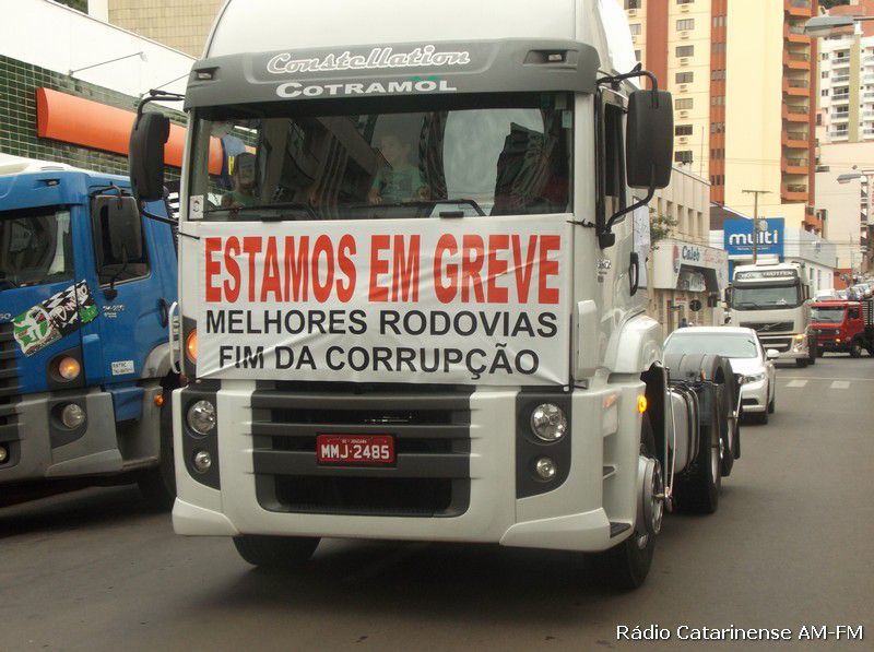 27/02/2015 Durante um pouco mais de uma hora, o comércio de Joaçaba se aliou e abraçou a reivindicação dos caminhoneiros que estão paralisados em várias regiões do país e em Santa Catarina, pedindo ao governo federal a diminuição no valor do diesel e melhores estradas.