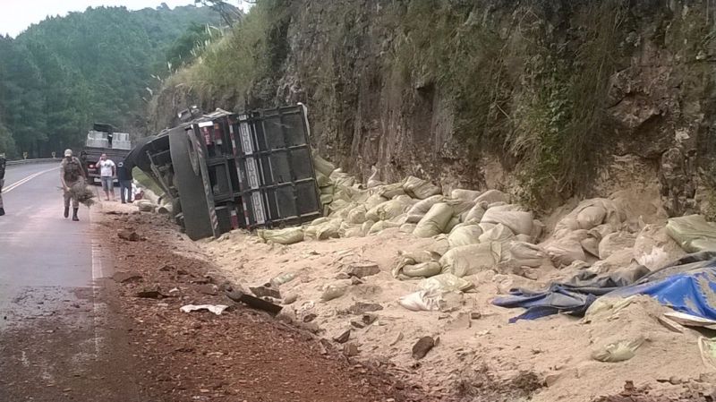 16/04/2015 Um caminhão carregado com sacos de farelo tombou na BR-282 em Herval d’Oeste no início da manhã desta quinta-feira (16). O acidente aconteceu por volta das 07h30, próximo da curva do “Passat”. O caminhão com placas de Grão Pará (SC) trafegava no sentido Erval Velho à Joaçaba. A carga de farelo ficou esparramada pelo acostamento. O motorista saiu ileso. O trânsito não chegou se interrompido, uma vez que o veículo ficou fora da pista.