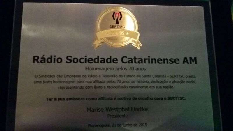 22/06/2015 Neste domingo (21) no hotel Caldas da Imperatriz na grande Florianópolis, a Rádio Catarinense foi homenageada por completar 70 anos de atividades. A homenagem foi do Sindicato Estadual de Emissoras de Rádio e TV durante encontro estadual, oportunidade em que também foram homenageadas outras emissoras pelo tempo de atividades. A Rádio Catarinense foi a terceira a ser instalada em Santa Catarina. A primeira foi a Rádio Clube de Blumenau.