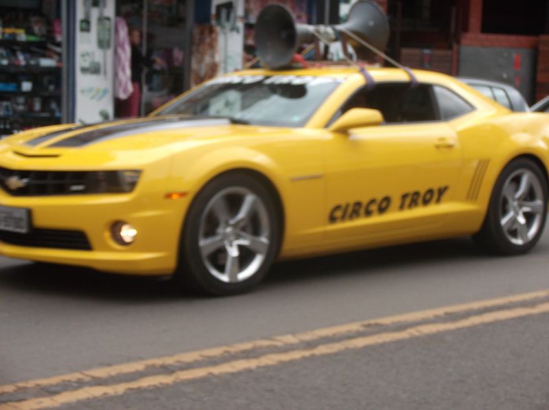 O Camaro amarelo do circo, com um alto-falante preso no teto com cordas, chama atenção por onde passa.