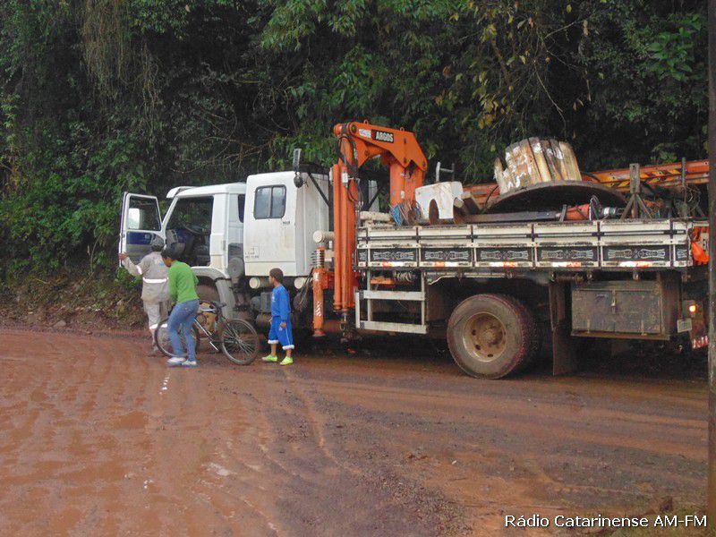 08/07/2015 Por volta das 17h desta quarta-feira (8), um caminhão que realizava reparos na energia elétrica da rua Itororó no bairro Nossa Senhora Aparecida em Herval d´Oeste, acabou derrapando e caindo nas águas do Rio Barra Verde. Na oportunidade quatro pessoas estavam no veículo e conseguiram sair a tempo, antes do caminhão afundar totalmente.