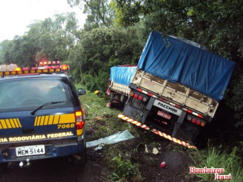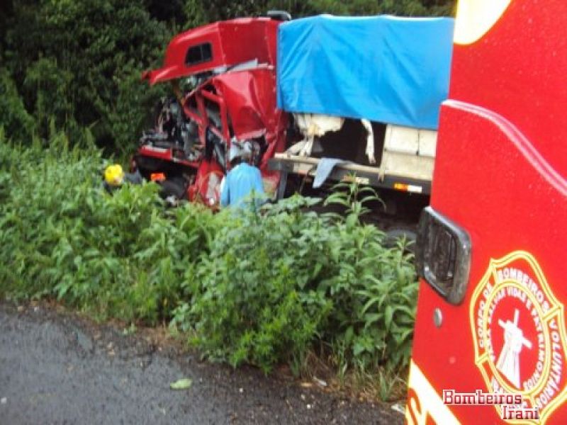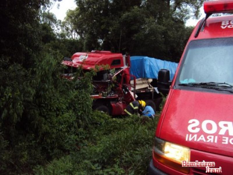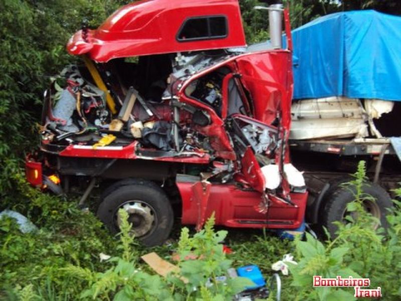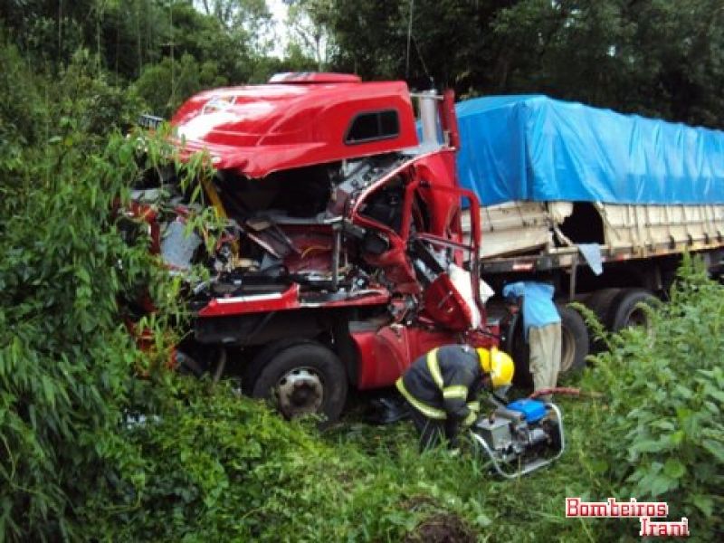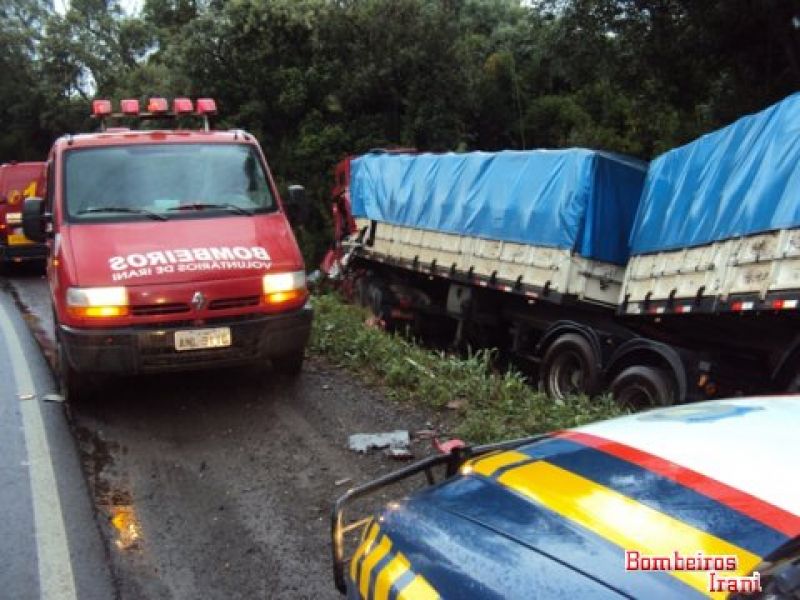 27/02/2012 Um acidente entre duas carretas por volta das 14h desta segunda-feira (27) deixou um homem gravemente ferido no km 30 da BR-153 na região de Água Doce. Os bombeiros voluntários de Irani foram solicitados pela Polícia Rodoviária Federal (PRF) de Vargem Bonita. Com a violência do impacto um dos veículos, com cavalo mecânico placa BCR-0421 e bitrem AQM-7817, ambos de Dois Vizinhos (PR), acabou parando fora da pista. Ele era conduzido por Auri Karvak, de 38 anos, que acabou preso entre as ferragens. A vítima apresentava suspeita de fratura no braço esquerdo, na perna esquerda e diversas escoriações pelo corpo. Ele foi imobilizado e conduzido ao hospital São Jorge de Irani. A outra carreta, com cavalo mecânico KAU-5598 e bitrem IKB-6488 ambos de São Miguel do Oeste (SC), conduzido por Fernando Franzosi, de 30 anos, que nada sofreu, teve pequenos danos . As causas do acidente serão apuradas pela PRF.