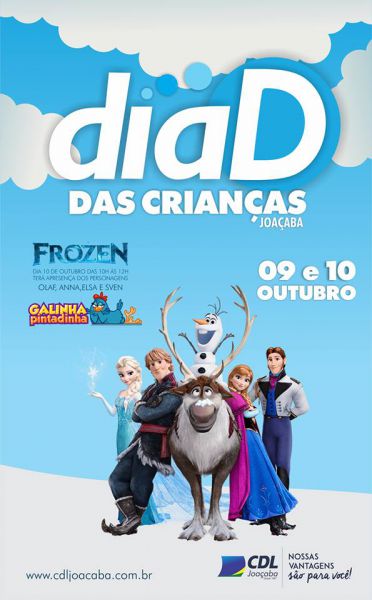 Preocupada em oferecer um momento especial para as crianças, a CDL vai contratou os personagens do filme Frozen. Olaf, Anna, Elsa e Sven estarão interagindo as crianças na praça em frente a prefeitura no sábado no horário das 10 às 12h. Será um momento único onde as crianças vão viver a magia do filme de animação da Disney. Além dos personagens do Frozen, a galinha Pintadinha também vai se encarregar de animar a plateia infantil. Toda programação será desenvolvida na praça Adolfo Konder.