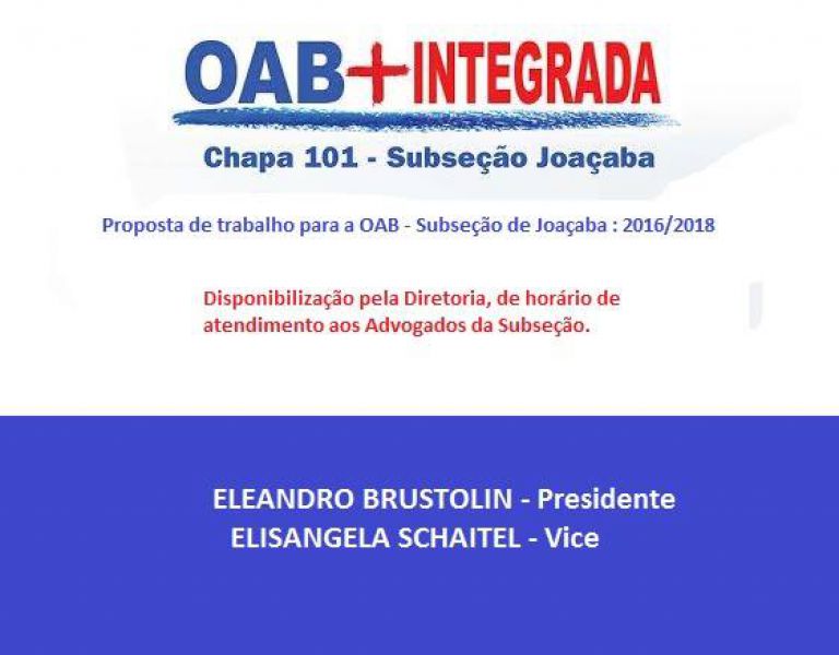 16/11/2015 A nova diretoria da Ordem dos Advogados do Brasil (OAB) da seccional de Joaçaba será conhecida nesta segunda-feira (16). A eleição para escolha dos novos dirigentes teve início as 09h e prosseguirá até as 17h na sede da entidade no edifício Itamaraty, na XV de Novembro. Houve consenso entre os advogados e apenas uma chapa acabou sendo inscrita para disputar a eleição. O candidato a presidente é o advogado Eleandro Brustolin e a vice Elisângela Schaitel. A votação acontece apenas na sede da OAB onde foi instalada uma urna eletrônica. Dos 450 advogados filiados, 360 tem direito a voto. O mandato inicia em janeiro e terá duração de 3 anos.